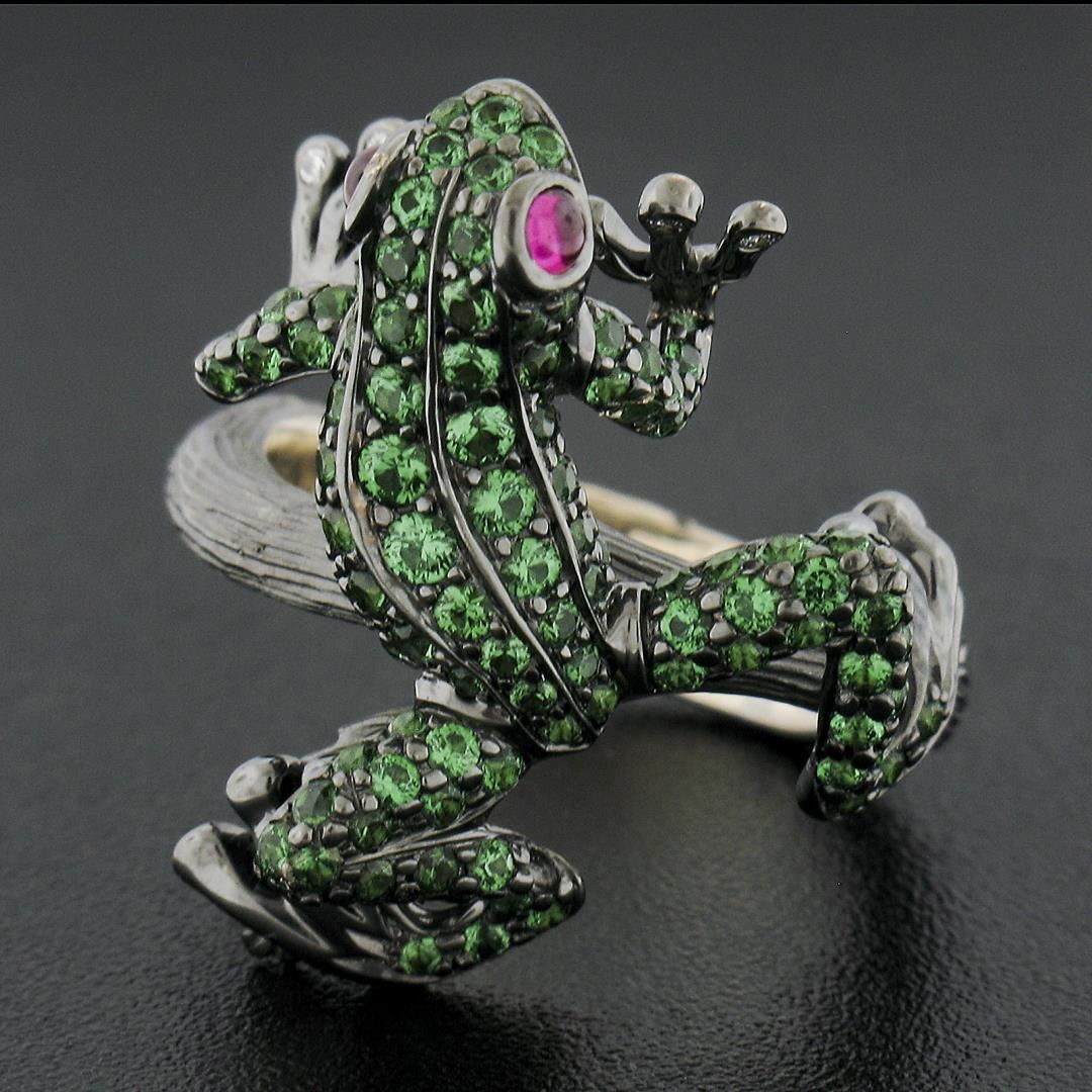 18K Gold & Black Rhodium Pave Tsavorite & Red Eyes Frog Body Cocktail Ring