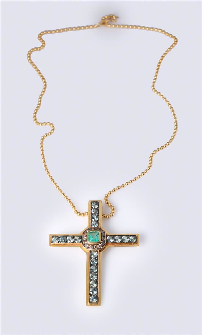 18k yellow gold cross pendant by Carlo Rici; with central bright green emerald surrounded by row of cognac diamonds on black oxidized ground, the arms of the cross set with numerous green sapphires; on gold beaded chain, the clasp marked 750 and pendant m