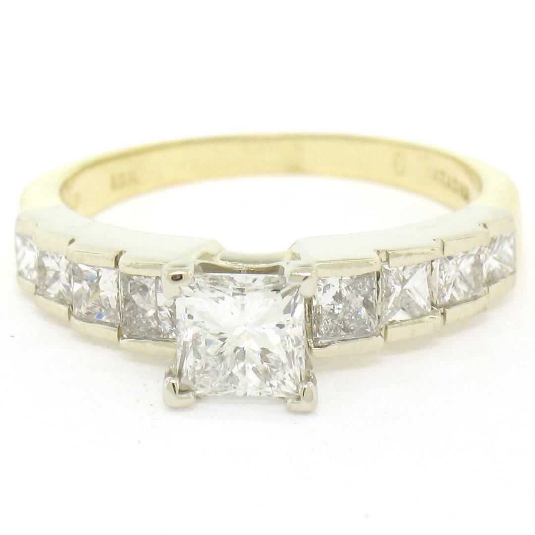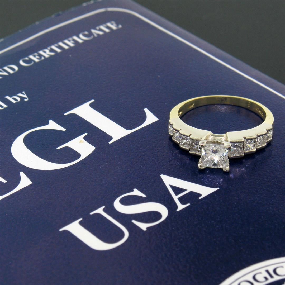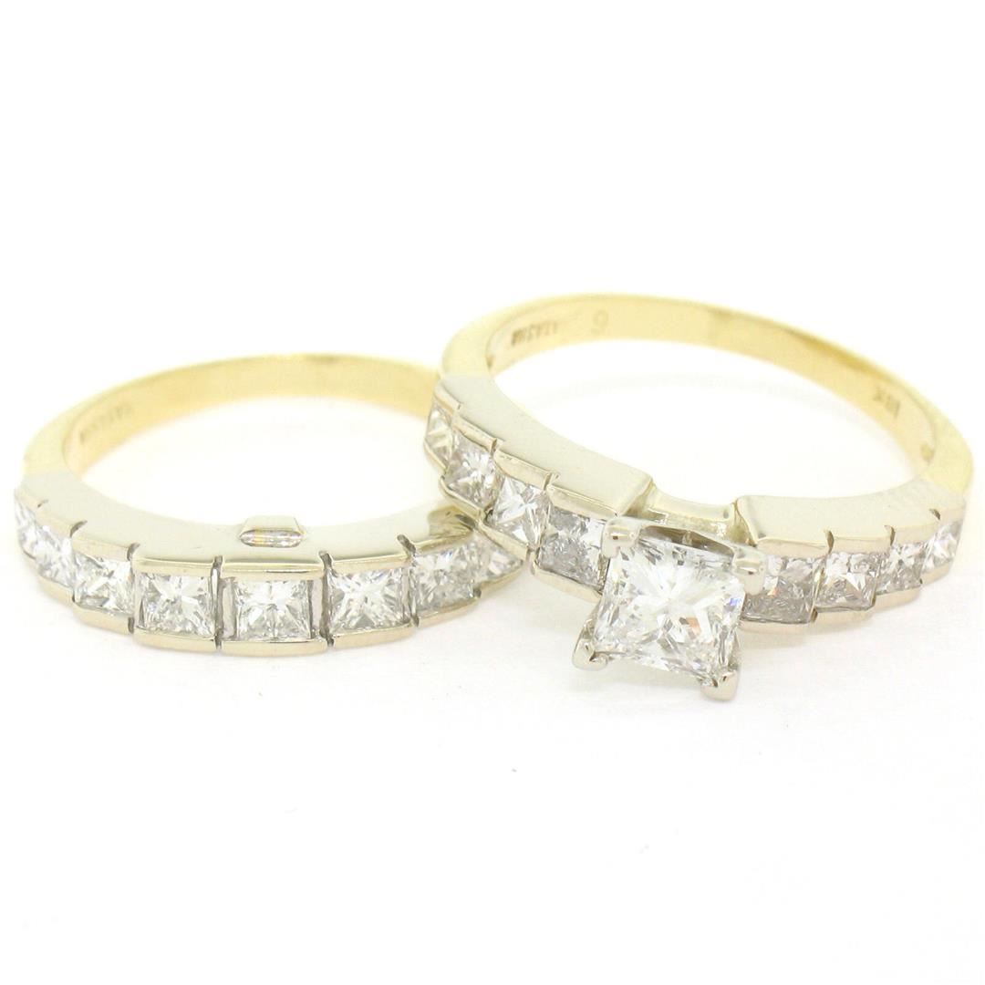 18K TT Gold 2.21ctw EGL Cert. Princess Cut Diamond Engagement & Wedding Ring Set. Please see photos and description for all available information. An estate solid 18k yellow and white gold engagement and wedding ring set, featuring 1 EGL certified princess cut natural diamond (G- SI2; 0.64ct), and 17 princess cut natural diamonds (G- SI1; 1.57ctw). The ring is size 5.75 and The band is size 5.5, weighs a total of 6.24 grams, and measures 8.45mm wide. Comes with all original relevant certifications.