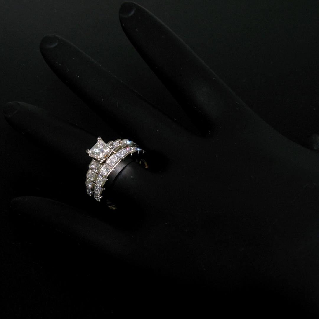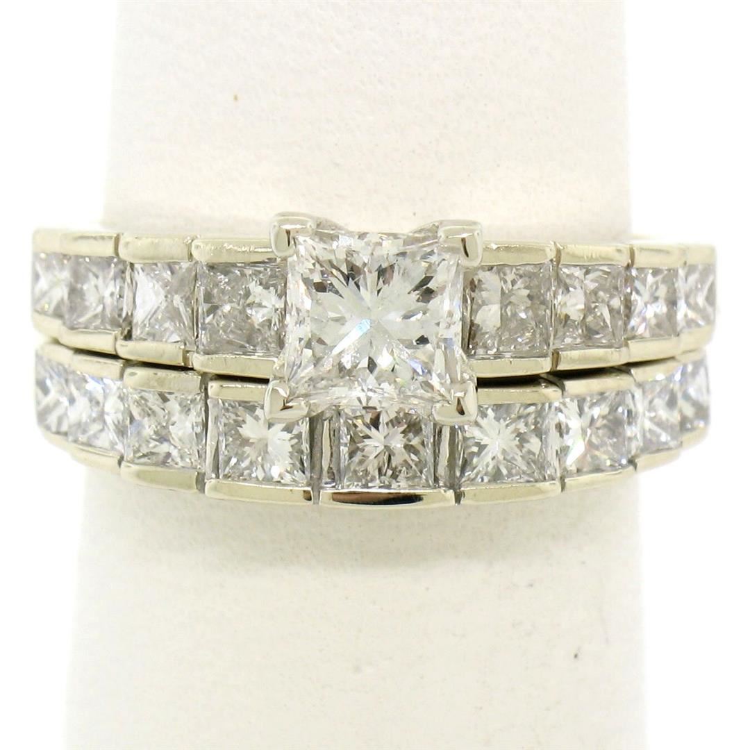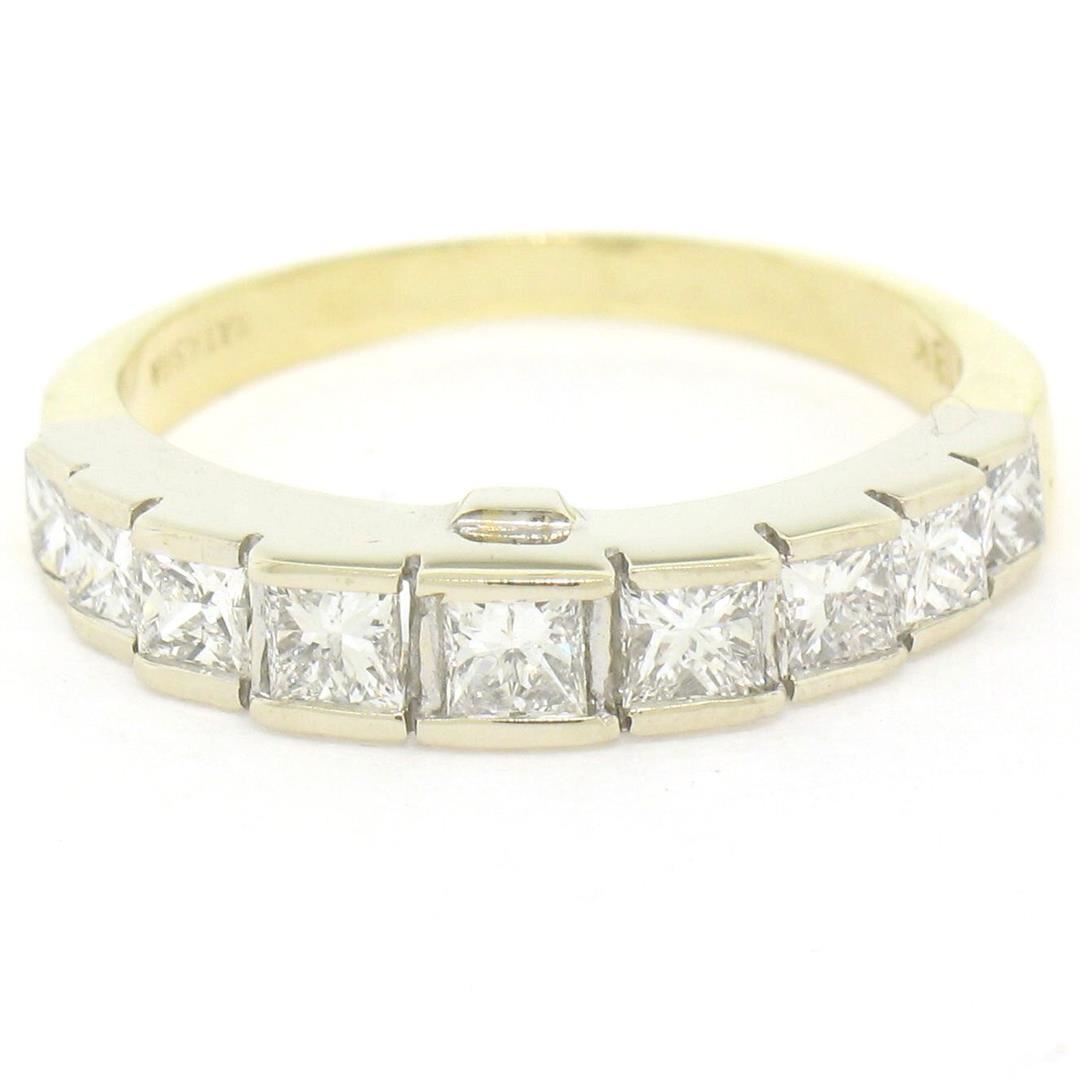 18K TT Gold 2.21ctw EGL Cert. Princess Cut Diamond Engagement & Wedding Ring Set. Please see photos and description for all available information. An estate solid 18k yellow and white gold engagement and wedding ring set, featuring 1 EGL certified princess cut natural diamond (G- SI2; 0.64ct), and 17 princess cut natural diamonds (G- SI1; 1.57ctw). The ring is size 5.75 and The band is size 5.5, weighs a total of 6.24 grams, and measures 8.45mm wide. Comes with all original relevant certifications.