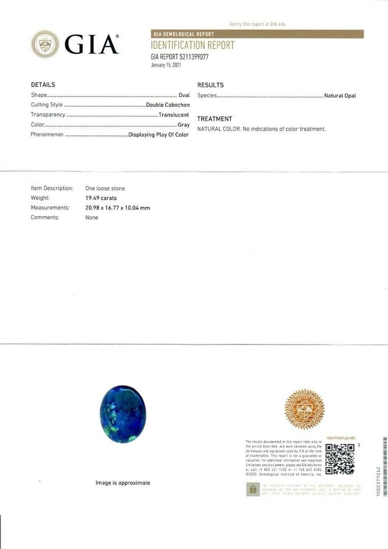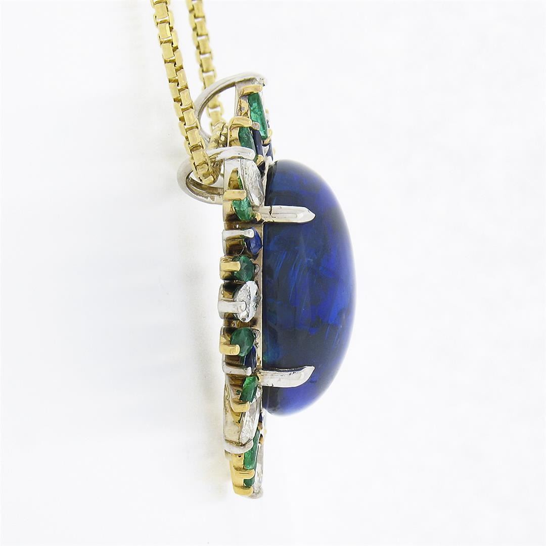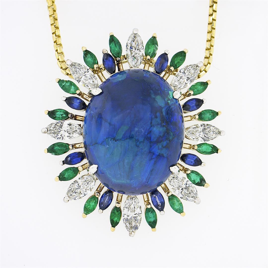 A solid 18k yellow and white gold pendant necklace, with 1 Gia certified oval cabochon cut natural opal (19.49ct ), surrounded with a halo of 16 marquise cut natural emeralds (1.25ctw), 8 marquise cut natural sapphires (0.72ctw), and 8 marquise cut natura