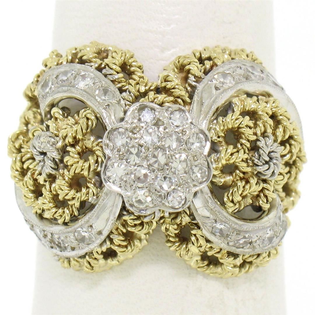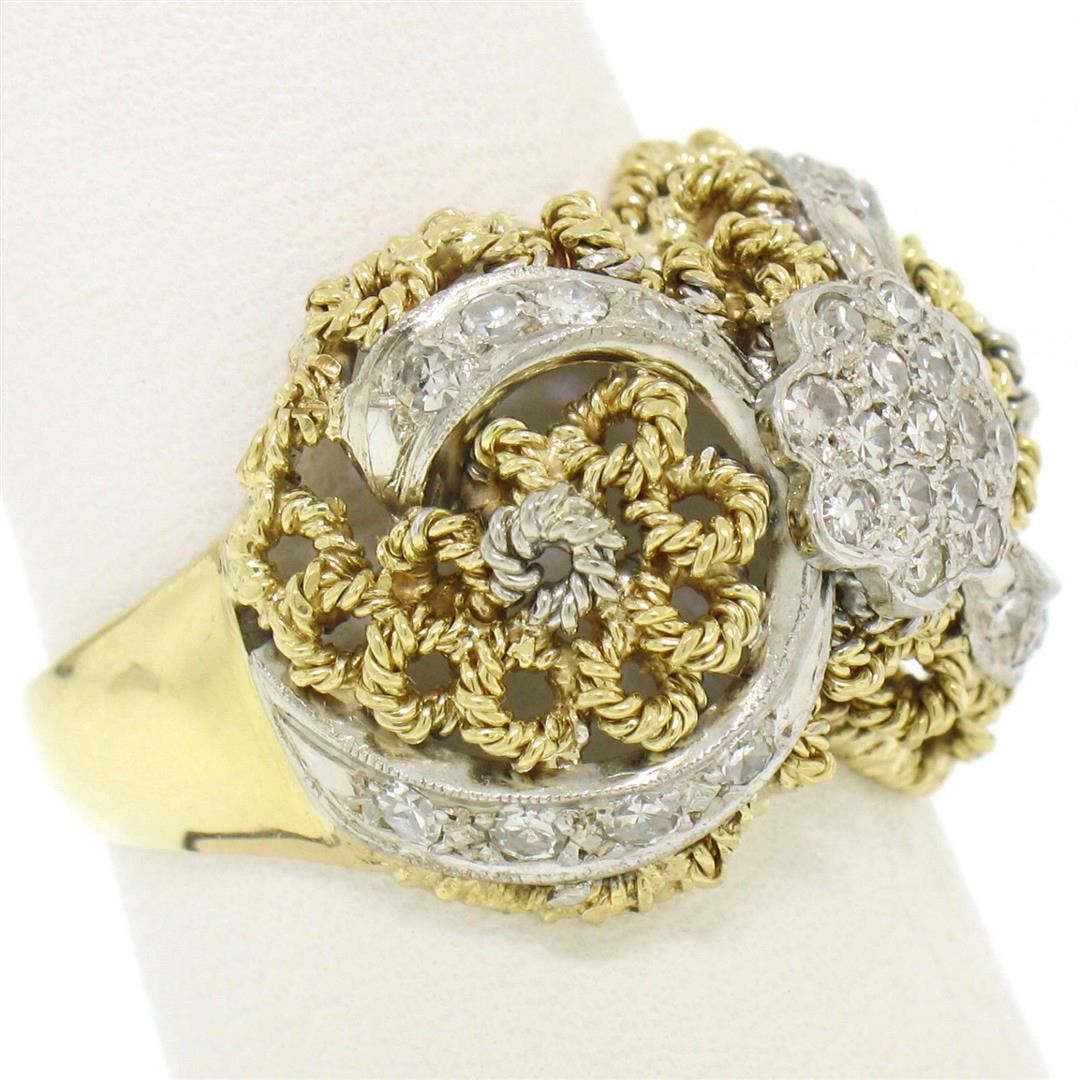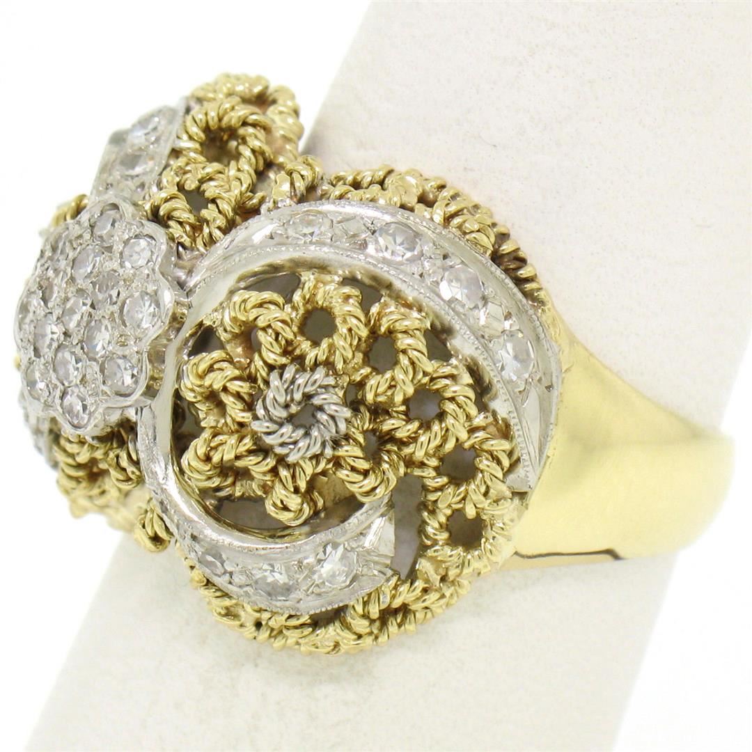 One 18K Two Tone Gold 0.45ctw Single Cut Diamond FINE Open Work Dome Cocktail Ring. Item Details - Material: Solid 18k Yellow and White Gold, Weight: 9.7 Grams, Stone(s): (31) Natural Genuine Diamonds - Single Cut - Pavé Set - F Color - VS1 Clarity - 0.45ctw (approx.), Ring Size: 7.5, Ring Width: 16.75mm, Ring Height: 7.85mm rise off the finger, Condition: Like new!