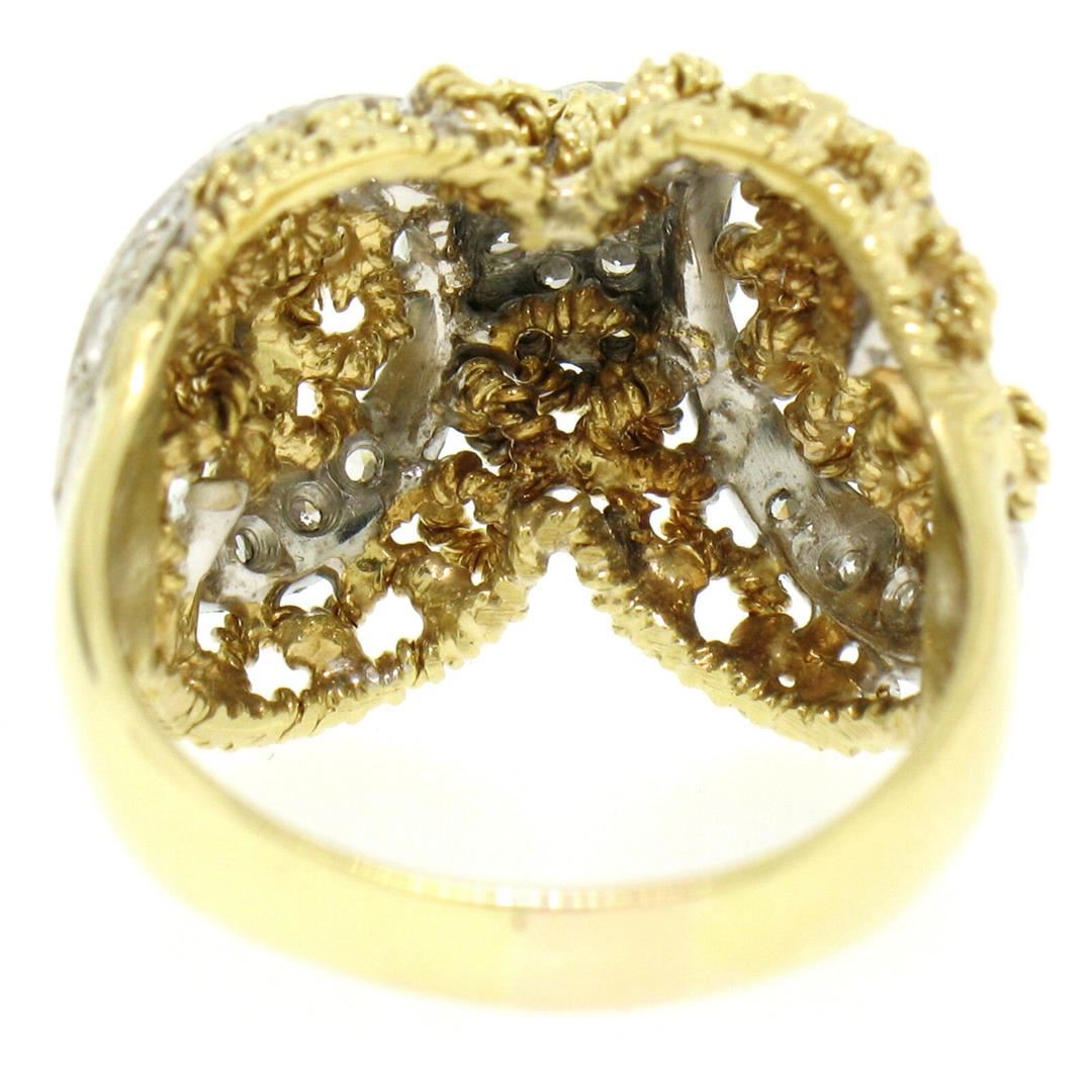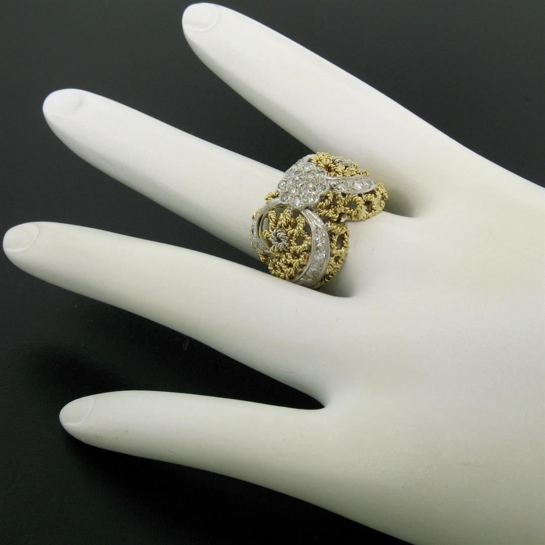 One 18K Two Tone Gold 0.45ctw Single Cut Diamond FINE Open Work Dome Cocktail Ring. Item Details - Material: Solid 18k Yellow and White Gold, Weight: 9.7 Grams, Stone(s): (31) Natural Genuine Diamonds - Single Cut - Pavé Set - F Color - VS1 Clarity - 0.45ctw (approx.), Ring Size: 7.5, Ring Width: 16.75mm, Ring Height: 7.85mm rise off the finger, Condition: Like new!