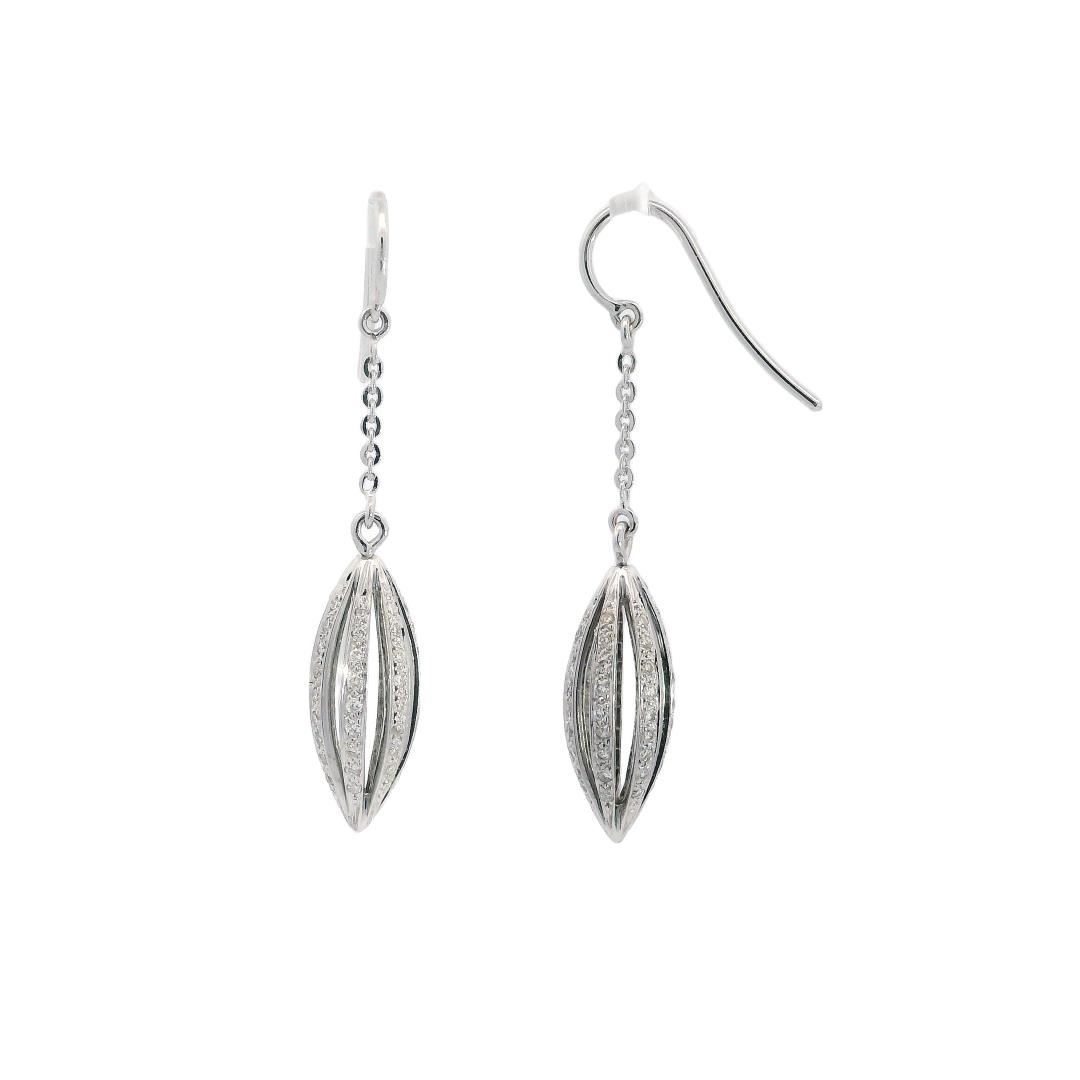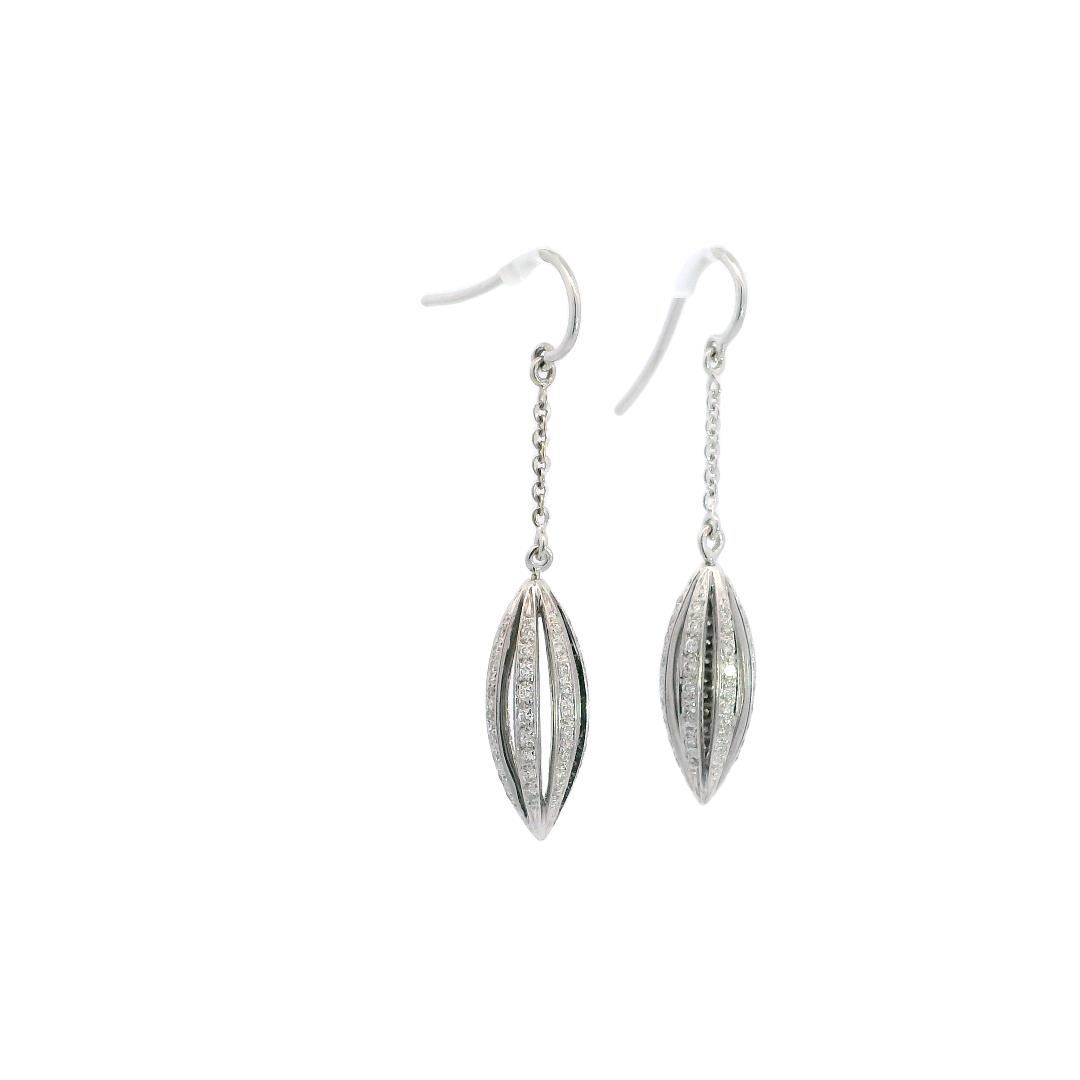 A pair of 18KT white gold marquise motif earrings featuring 0.70ct of round brilliant cut diamonds graded VS-1 to VS-2 clarity. The earrings have a 39mm drop and are designed with elegant ear wires.
