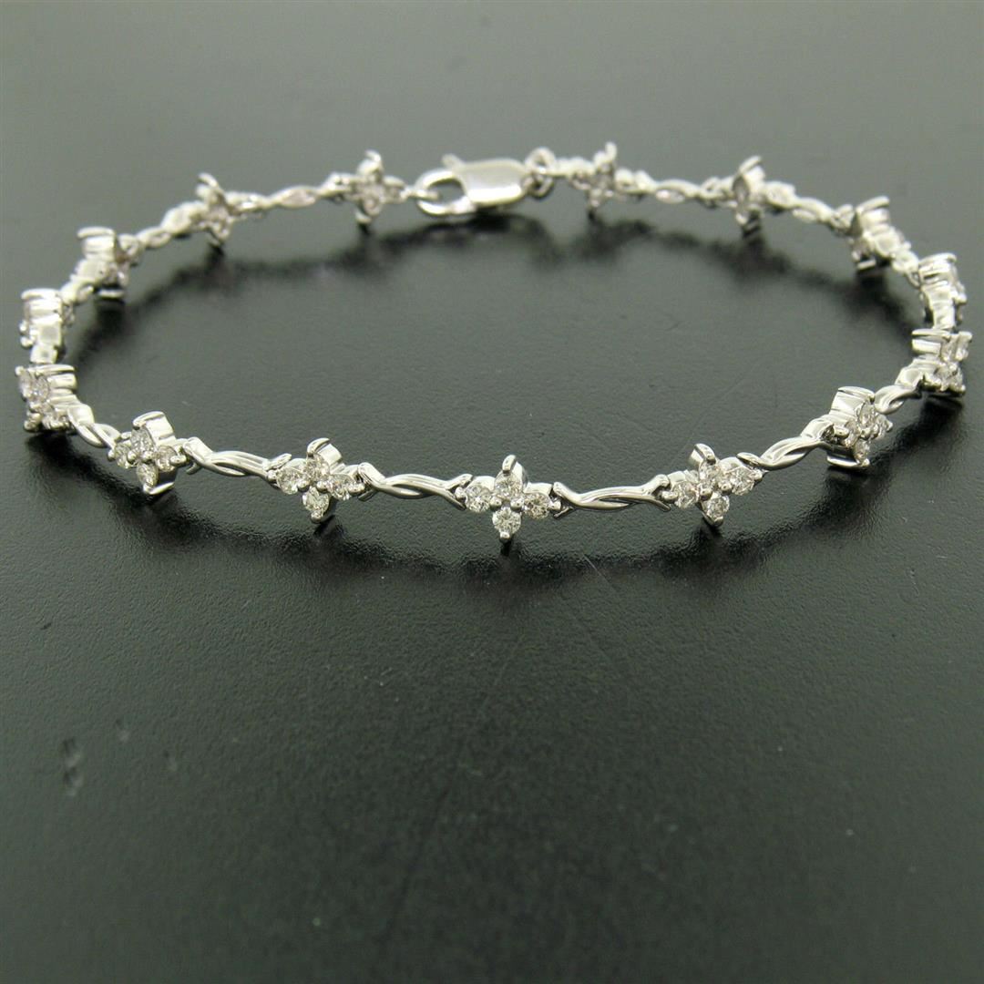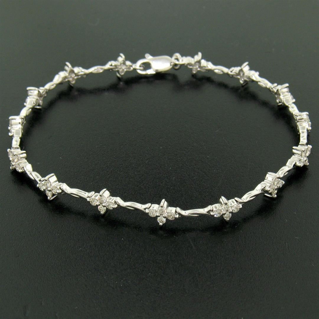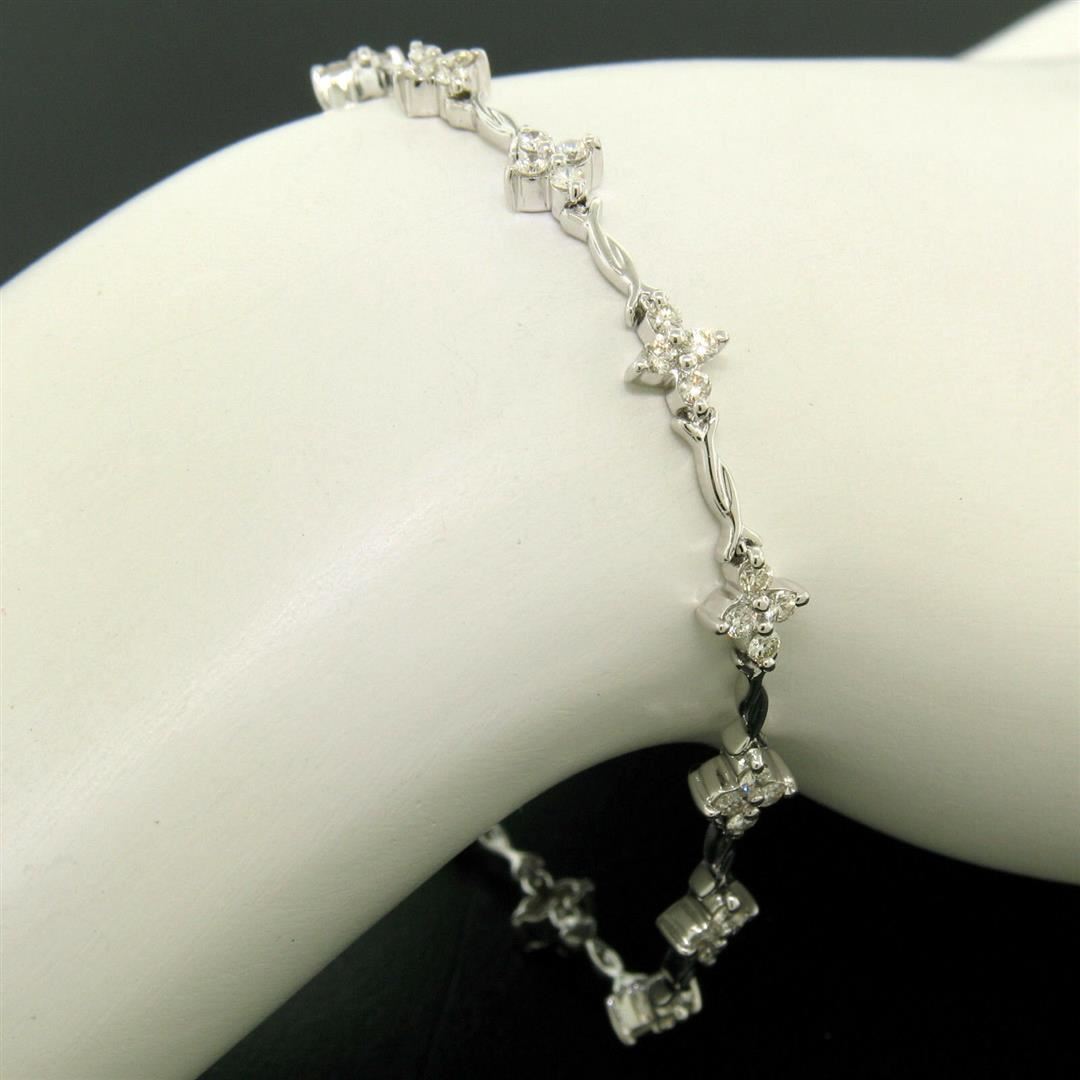 One 18K White Gold 1.65ctw Prong Round Diamond Flower Cluster Link Tennis Bracelet. Item Details: Material: 18K Solid White Gold, Weight: 8.0 Grams, Stone(s): (60) Natural Genuine Diamonds - Round Brilliant Cut - Prong Set - VS1/VS2 Clarity - G/H Color, Chain Type: Twisted Links w/ Flower Clusters Between, Chain Length: 8 Inches, Clasp: Lobster Claw, Width: 5.5mm, Thickness: 3.2mm rise off the wrist Condition: Like New!