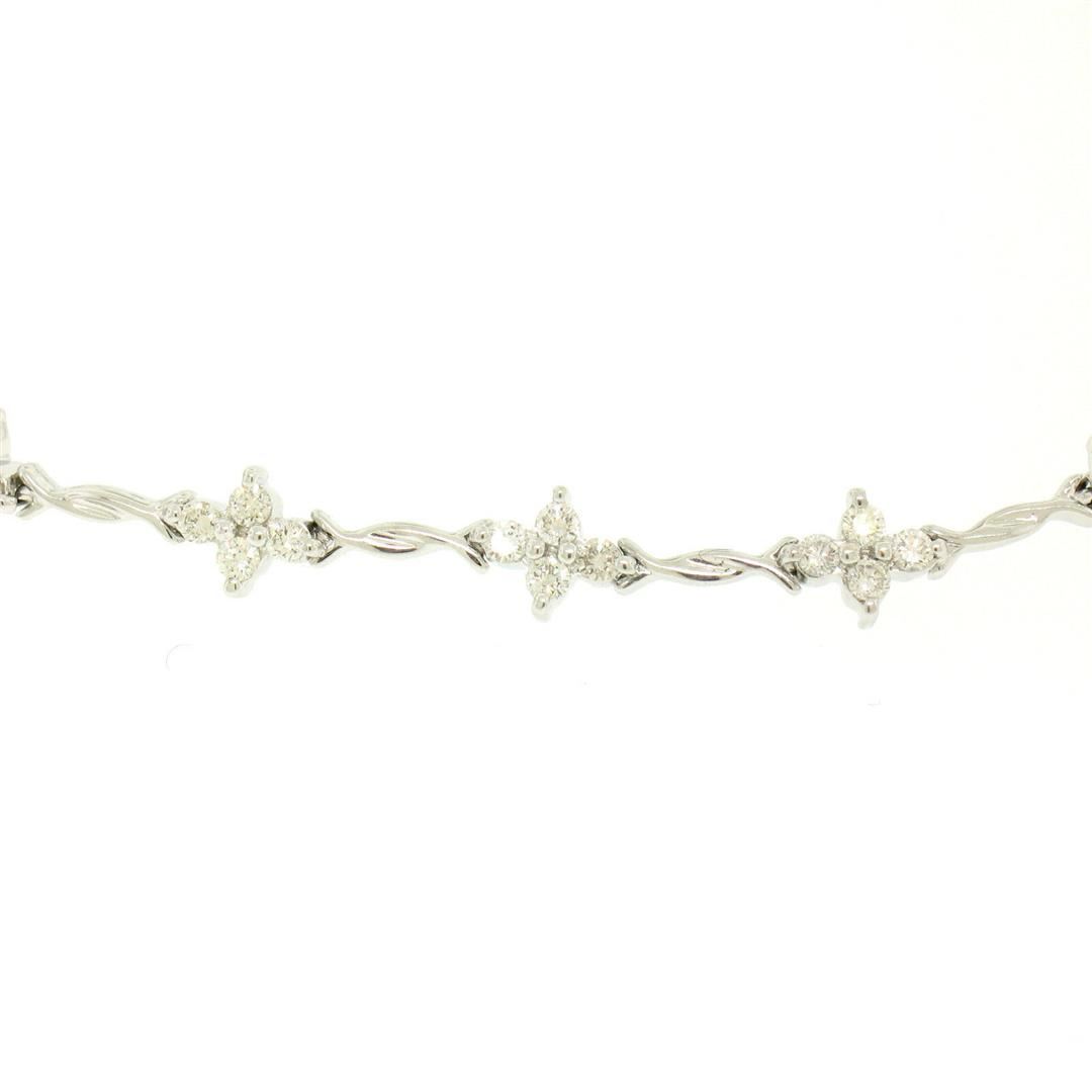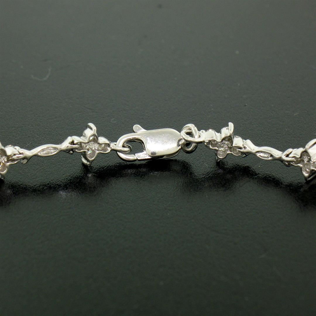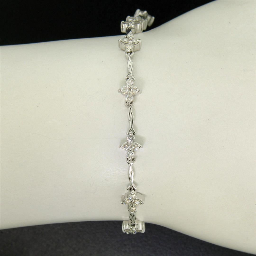 One 18K White Gold 1.65ctw Prong Round Diamond Flower Cluster Link Tennis Bracelet. Item Details: Material: 18K Solid White Gold, Weight: 8.0 Grams, Stone(s): (60) Natural Genuine Diamonds - Round Brilliant Cut - Prong Set - VS1/VS2 Clarity - G/H Color, Chain Type: Twisted Links w/ Flower Clusters Between, Chain Length: 8 Inches, Clasp: Lobster Claw, Width: 5.5mm, Thickness: 3.2mm rise off the wrist Condition: Like New!