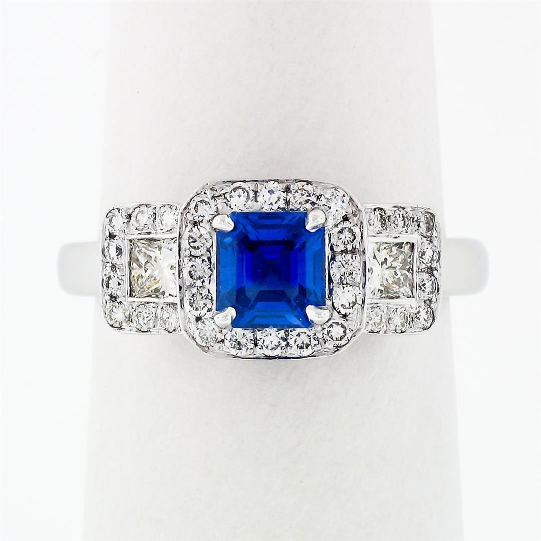 A solid 18k white gold solitaire ring, with 1 AGL certified square emerald cut natural sapphire (5.36 x 5.05mm; 0.88ct), and 2 princess cut natural diamonds (G/H - VS1; 0.26ctw), surrounded with 32 round brilliant cut natural diamonds (G/H - VS1/VS2; 0.56ctw). The ring is size 6.5, weighs a total of 5.19 grams, and measures 8.35mm wide. Comes with all original relevant certifications.