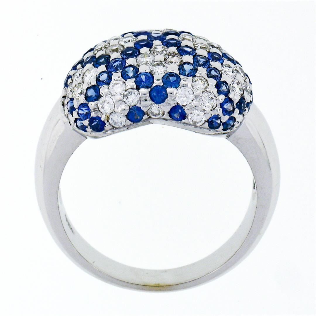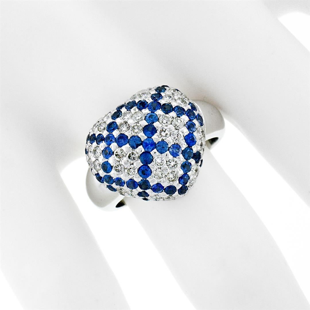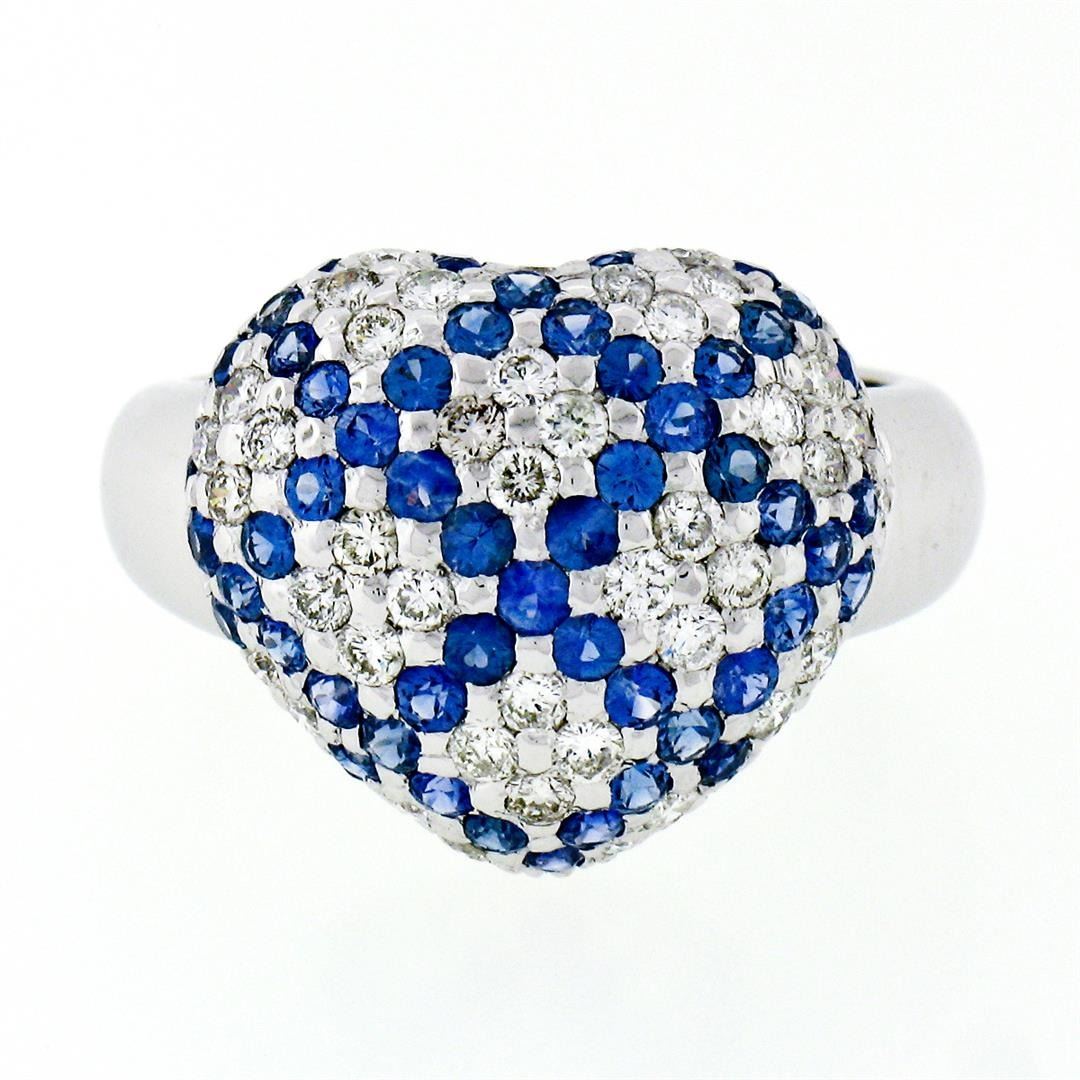 An estate solid 18k white gold heart ring, with 57 round brilliant cut natural sapphires (1.20ctw), and 42 round brilliant cut natural diamonds (G/H- VS1/VS2 ; 0.75ctw). The ring is size 6.5, weighs a total of 7.16 grams, and measures 15mm wide.