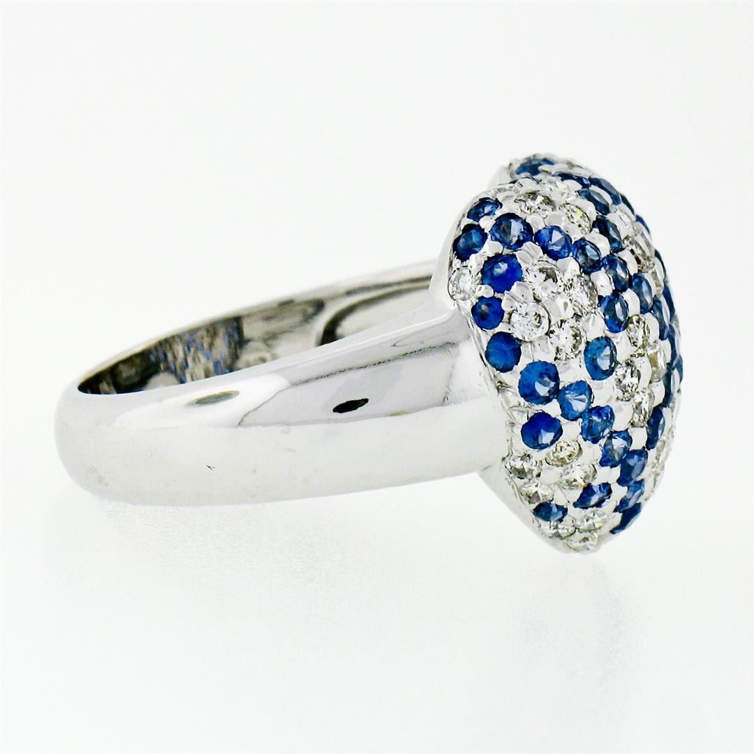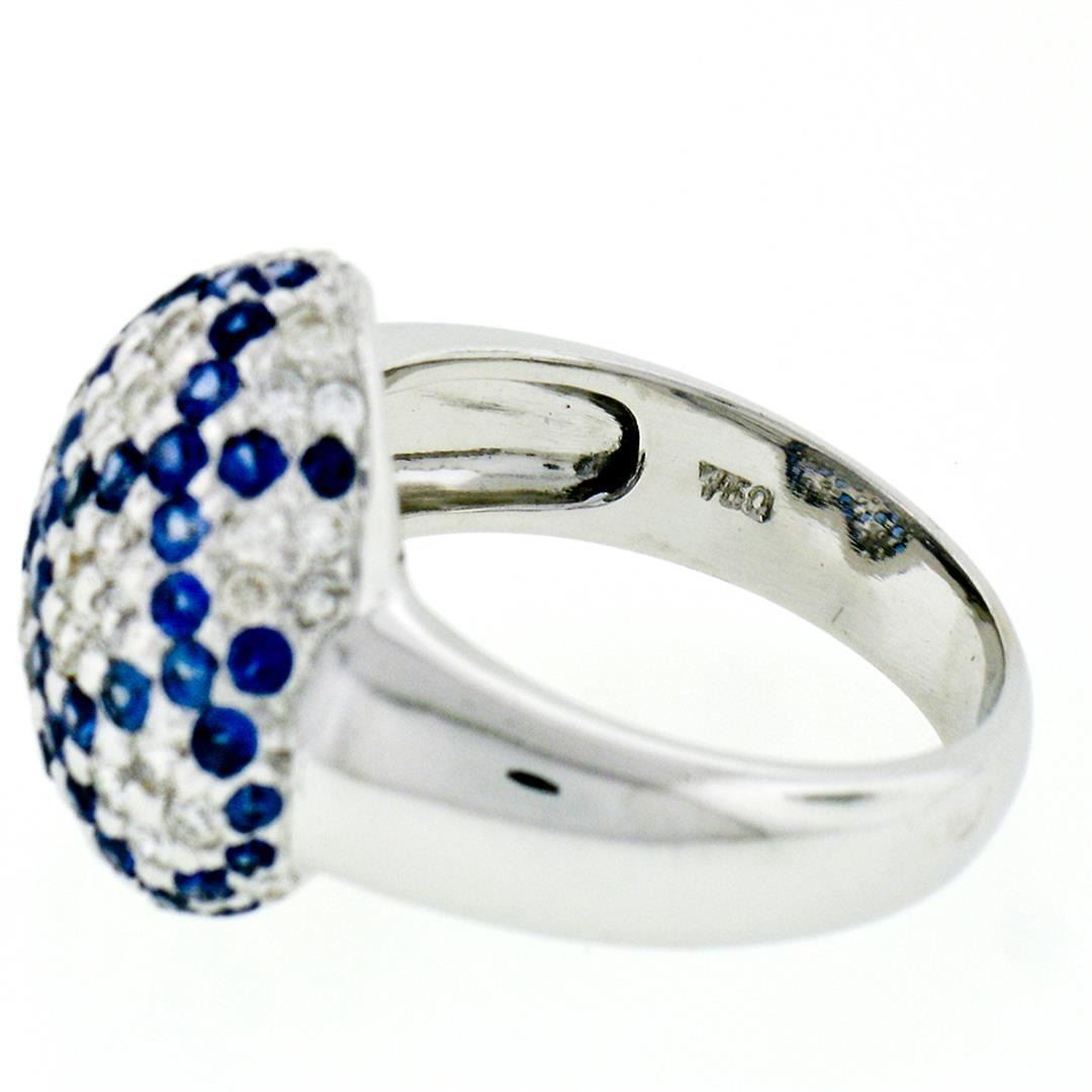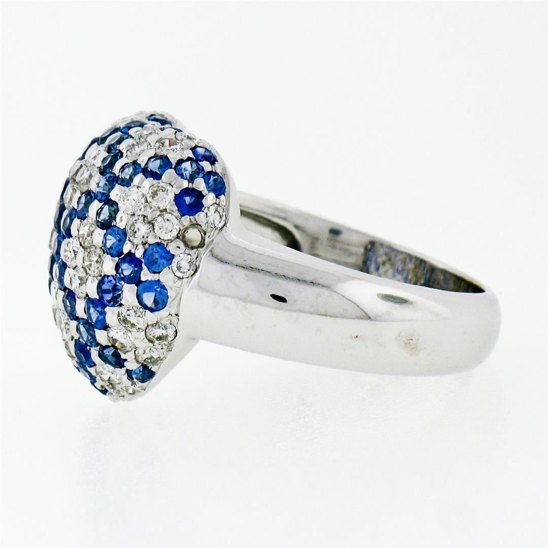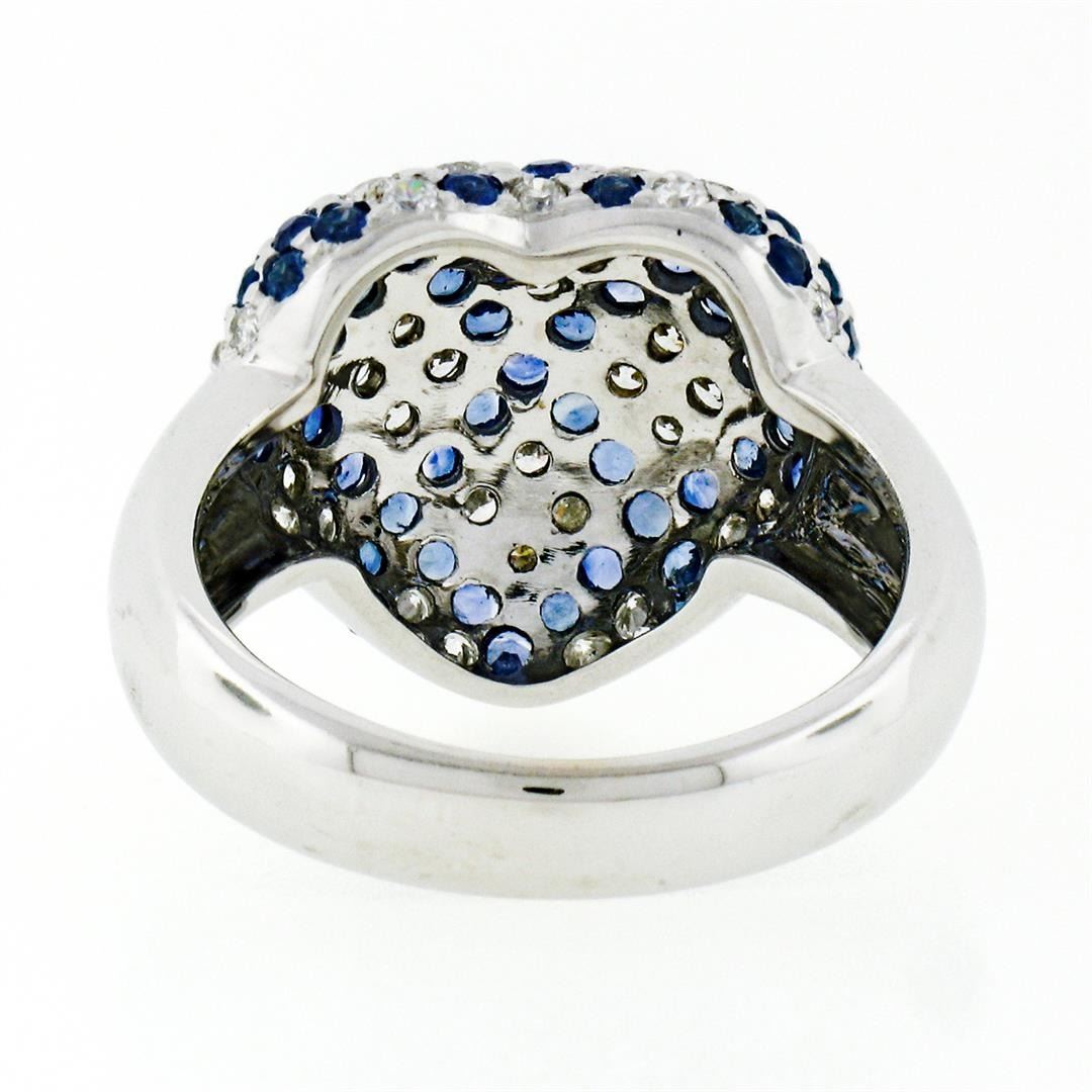 An estate solid 18k white gold heart ring, with 57 round brilliant cut natural sapphires (1.20ctw), and 42 round brilliant cut natural diamonds (G/H- VS1/VS2 ; 0.75ctw). The ring is size 6.5, weighs a total of 7.16 grams, and measures 15mm wide.