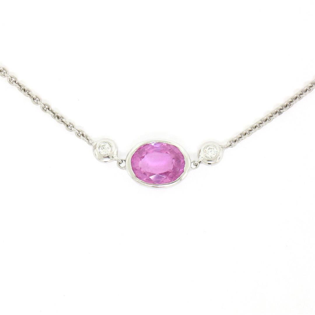 One NEW 18K White Gold 1.37ct GIA Certified Pink Sapphire & Diamond Pendant w/ 16" Chain. Item Details: Material: 18K Solid White Gold, Weight: 4.10 Grams, Stone(s): (1) Natural Genuine Sapphire, (2) Natural Genuine Diamonds - Round Brilliant Cut - Bezel Set - VS1 Clarity - G Color - 0.06ctw (approx.), Total Carat Weight: 1.37 (approx.), Chain Type: Fine Cable Link, Chain Length: 16 Inches (Including the stones.), Clasp: Lobster Claw, Pendant Width: 19.20mm (from diamond to diamond), Pendant Thickness: 3.50mm, Pendant Height: 7.10mm, Condition: Brand New w/o Tag. Comes w/ Original GIA Certification!, GIA Certification, GIA Report Number: 2171803423, Shape: Oval, Cutting Style (Crown): Brilliant Cut, Cutting Style (Pavilion): Step Cut, Transparency: Transparent, Color: Purplish Pink, Species: Natural Corundum, Variety: Sapphire, Treatment: Heated, Measurements: 7.70 x 5.74 x 3.70 mm