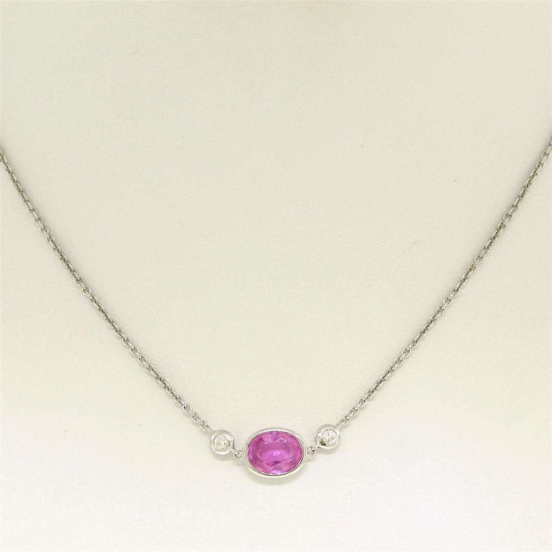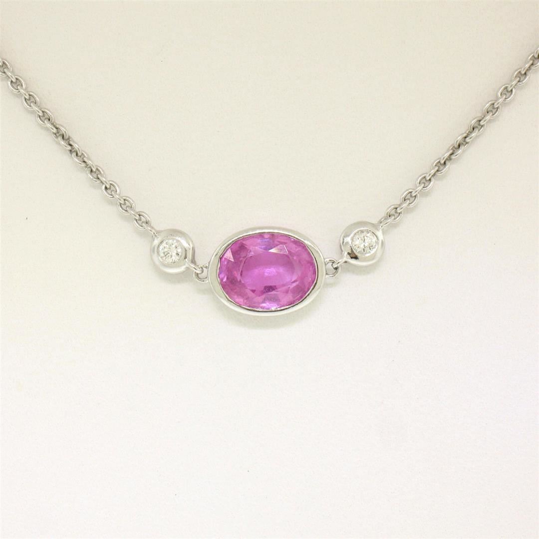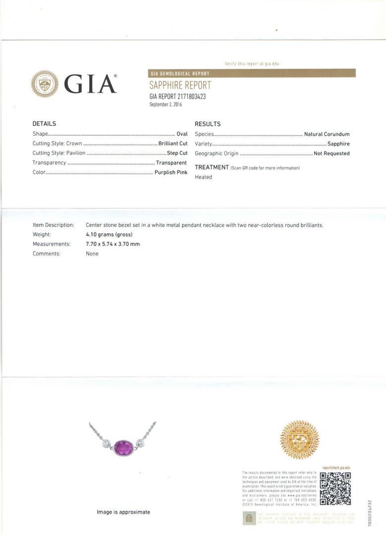One NEW 18K White Gold 1.37ct GIA Certified Pink Sapphire & Diamond Pendant w/ 16" Chain. Item Details: Material: 18K Solid White Gold, Weight: 4.10 Grams, Stone(s): (1) Natural Genuine Sapphire, (2) Natural Genuine Diamonds - Round Brilliant Cut - Bezel Set - VS1 Clarity - G Color - 0.06ctw (approx.), Total Carat Weight: 1.37 (approx.), Chain Type: Fine Cable Link, Chain Length: 16 Inches (Including the stones.), Clasp: Lobster Claw, Pendant Width: 19.20mm (from diamond to diamond), Pendant Thickness: 3.50mm, Pendant Height: 7.10mm, Condition: Brand New w/o Tag. Comes w/ Original GIA Certification!, GIA Certification, GIA Report Number: 2171803423, Shape: Oval, Cutting Style (Crown): Brilliant Cut, Cutting Style (Pavilion): Step Cut, Transparency: Transparent, Color: Purplish Pink, Species: Natural Corundum, Variety: Sapphire, Treatment: Heated, Measurements: 7.70 x 5.74 x 3.70 mm
