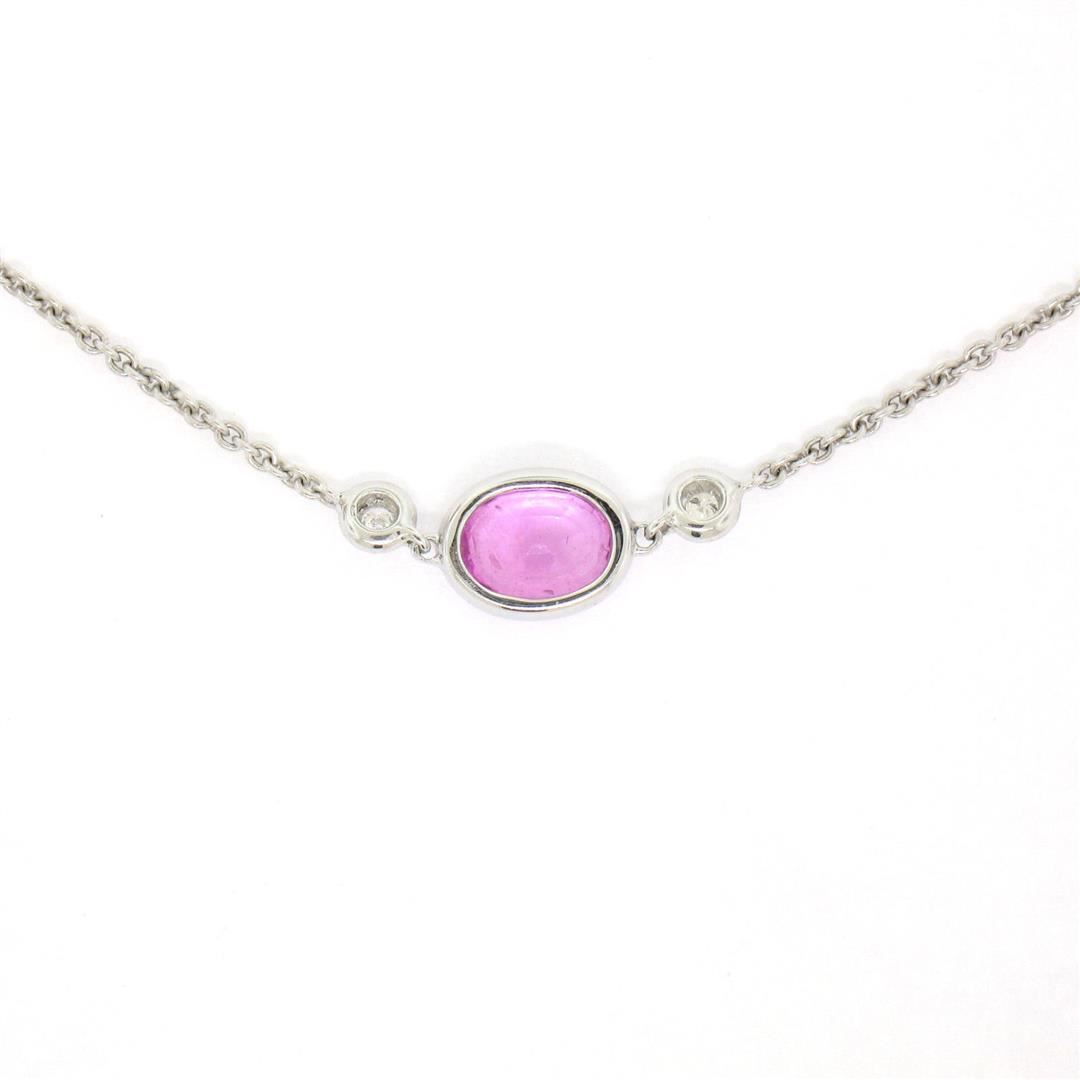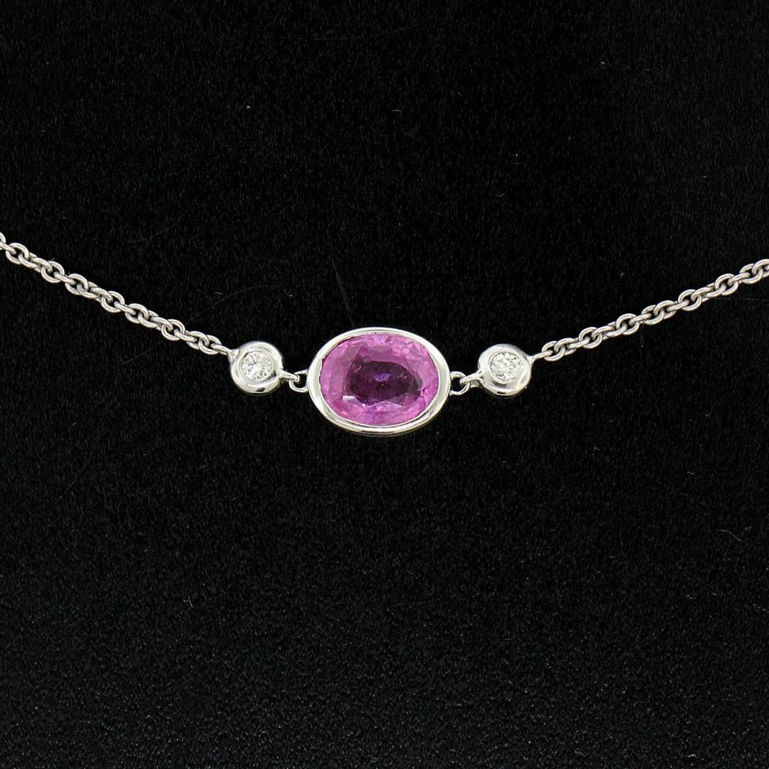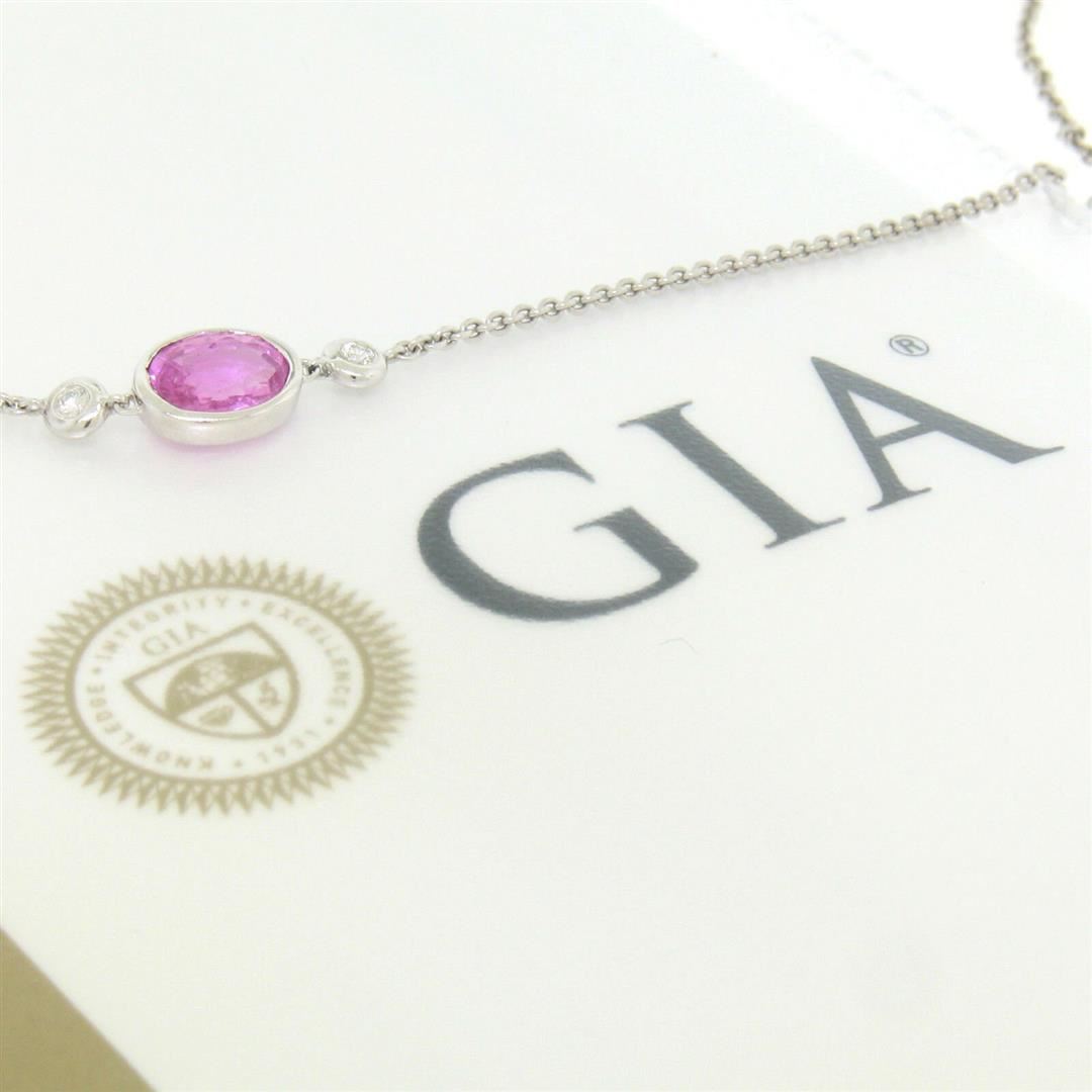 One NEW 18K White Gold 1.37ct GIA Certified Pink Sapphire & Diamond Pendant w/ 16" Chain. Item Details: Material: 18K Solid White Gold, Weight: 4.10 Grams, Stone(s): (1) Natural Genuine Sapphire, (2) Natural Genuine Diamonds - Round Brilliant Cut - Bezel Set - VS1 Clarity - G Color - 0.06ctw (approx.), Total Carat Weight: 1.37 (approx.), Chain Type: Fine Cable Link, Chain Length: 16 Inches (Including the stones.), Clasp: Lobster Claw, Pendant Width: 19.20mm (from diamond to diamond), Pendant Thickness: 3.50mm, Pendant Height: 7.10mm, Condition: Brand New w/o Tag. Comes w/ Original GIA Certification!, GIA Certification, GIA Report Number: 2171803423, Shape: Oval, Cutting Style (Crown): Brilliant Cut, Cutting Style (Pavilion): Step Cut, Transparency: Transparent, Color: Purplish Pink, Species: Natural Corundum, Variety: Sapphire, Treatment: Heated, Measurements: 7.70 x 5.74 x 3.70 mm