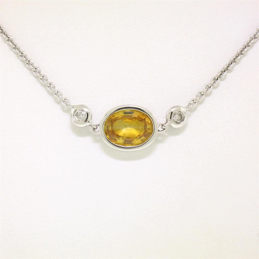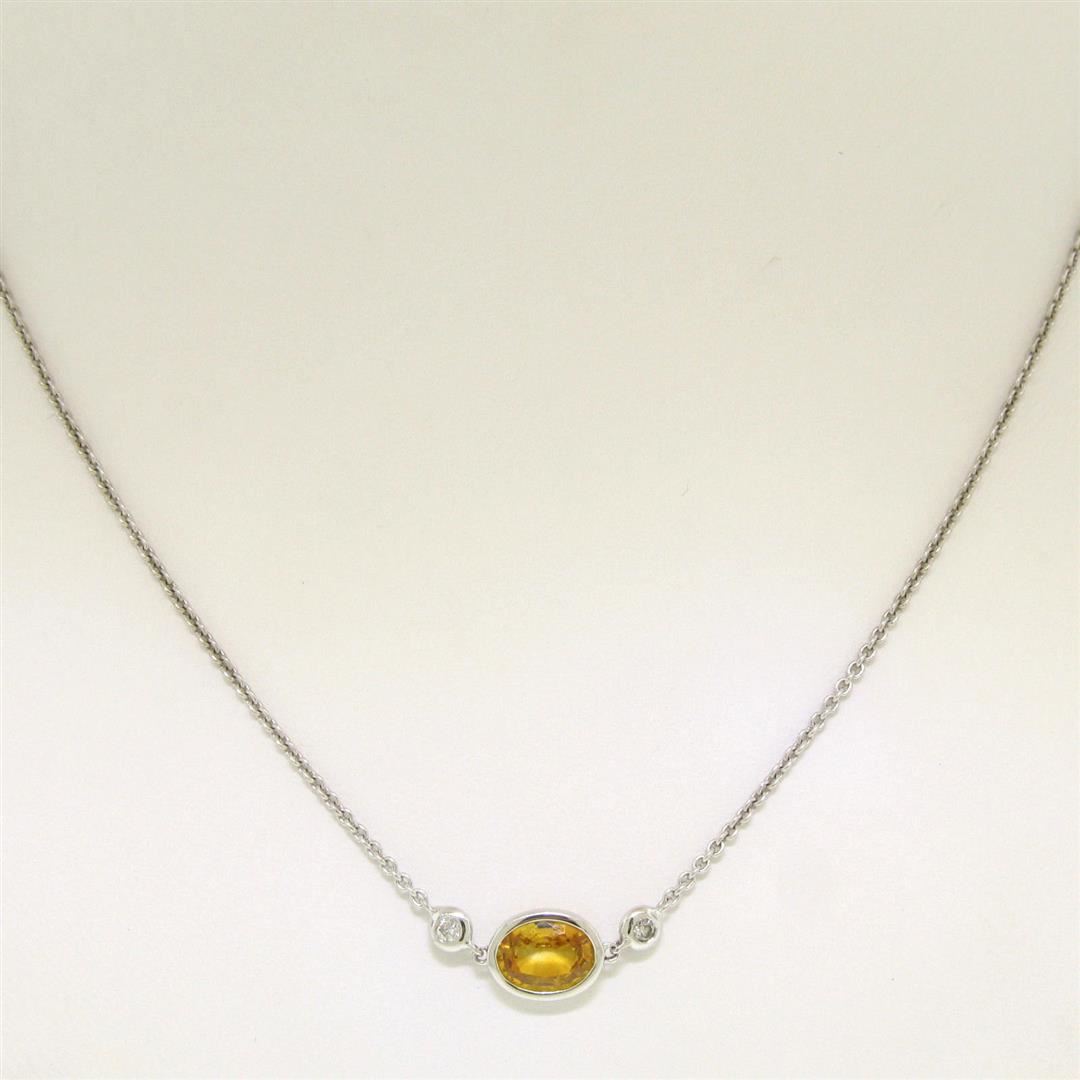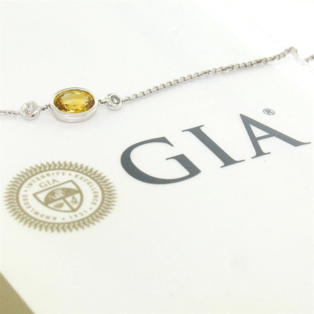 One NEW 18K White Gold 1.25ct GIA Certified Yellow Sapphire & Diamond Pendant w/ 18" Chain. Item Details: Material: 18K Solid White Gold, Weight: 4.34 Grams, Stone(s): (1) Natural Genuine Sapphire - *See Certification Details Below*, (2) Natural Genuine Diamonds - Round Brilliant Cut - Bezel Set - VS1 Clarity - G Color - 0.06ctw (approx.), Total Carat Weight: 1.25 (approx.), Chain Type: Fine Cable Link, Chain Length: 18 Inches (Including the stones.), Clasp: Lobster Claw, Pendant Width: 19.60mm (From diamond to diamond.), Pendant Height: 7.36mm, Pendant Thickness: 3.41mm, Condition: Brand New w/o Tag. Comes w/ Original GIA Certification!, GIA Certification, GIA Report Number: 5171803387, Shape: Oval, Cutting Style: Crown: Brilliant Cut, Cutting Style: Pavilion: Step Cut, Transparency: Transparent, Color: Orangy Yellow, Species: Natural Corundum, Variety: Sapphire, Treatment: Heated, Measurements: 7.19 x 5.60 x 3.69 mm