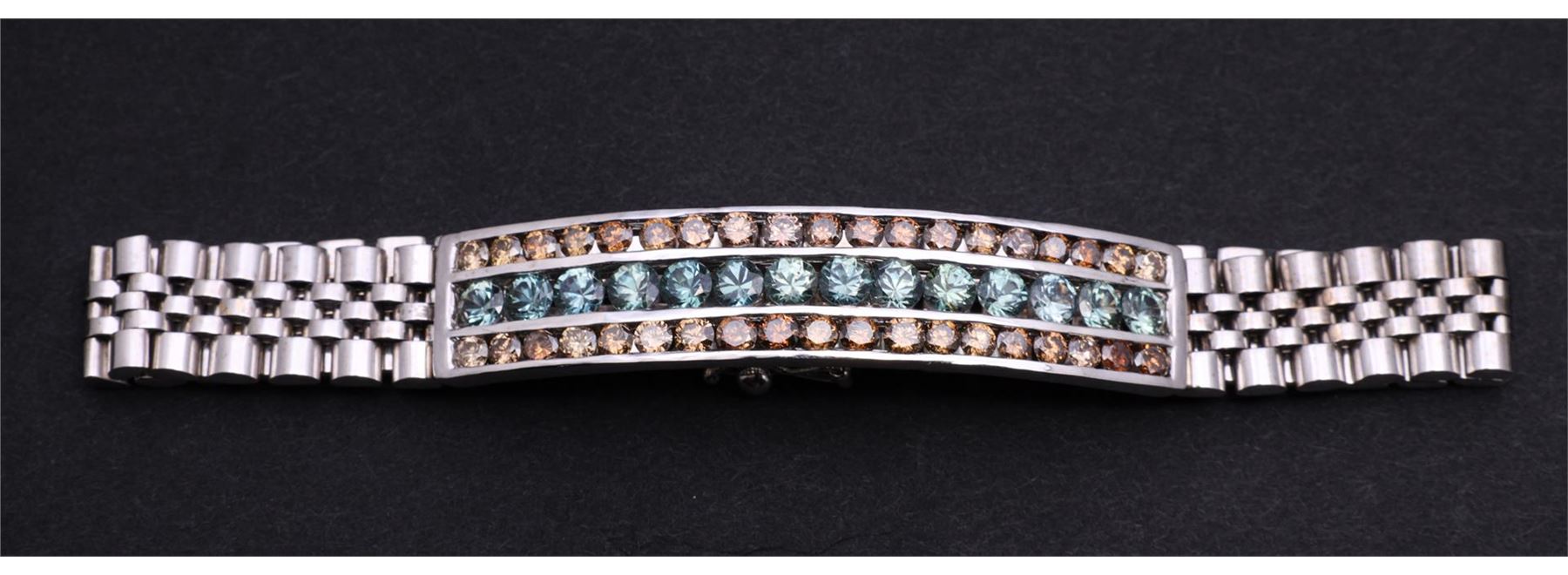 18k white gold cognac diamond and greenish blue sapphire ID bracelet by Carlo Rici, marked CR750 to clasp; gross weight 32.9 g, L 8" (approx.)