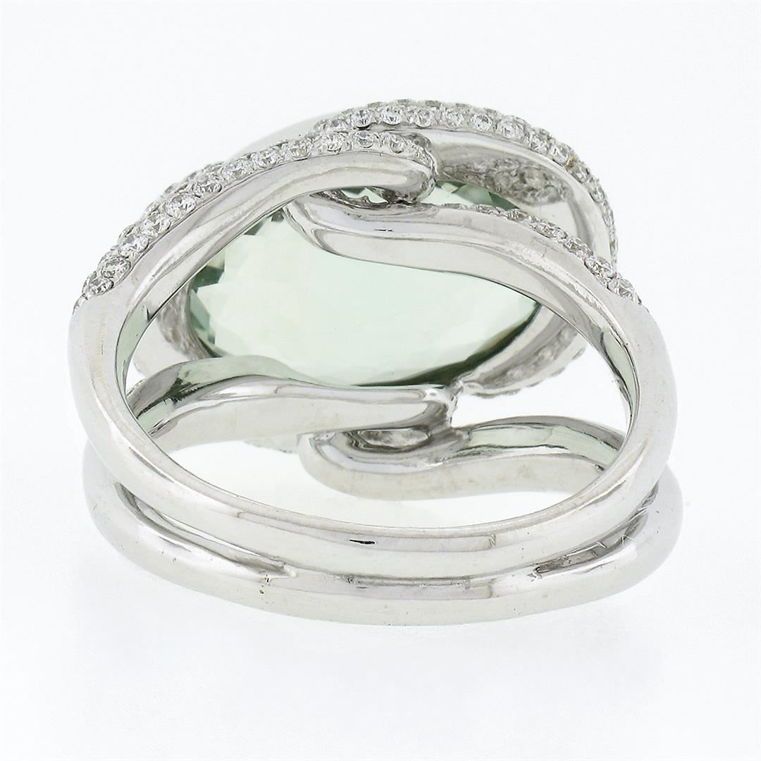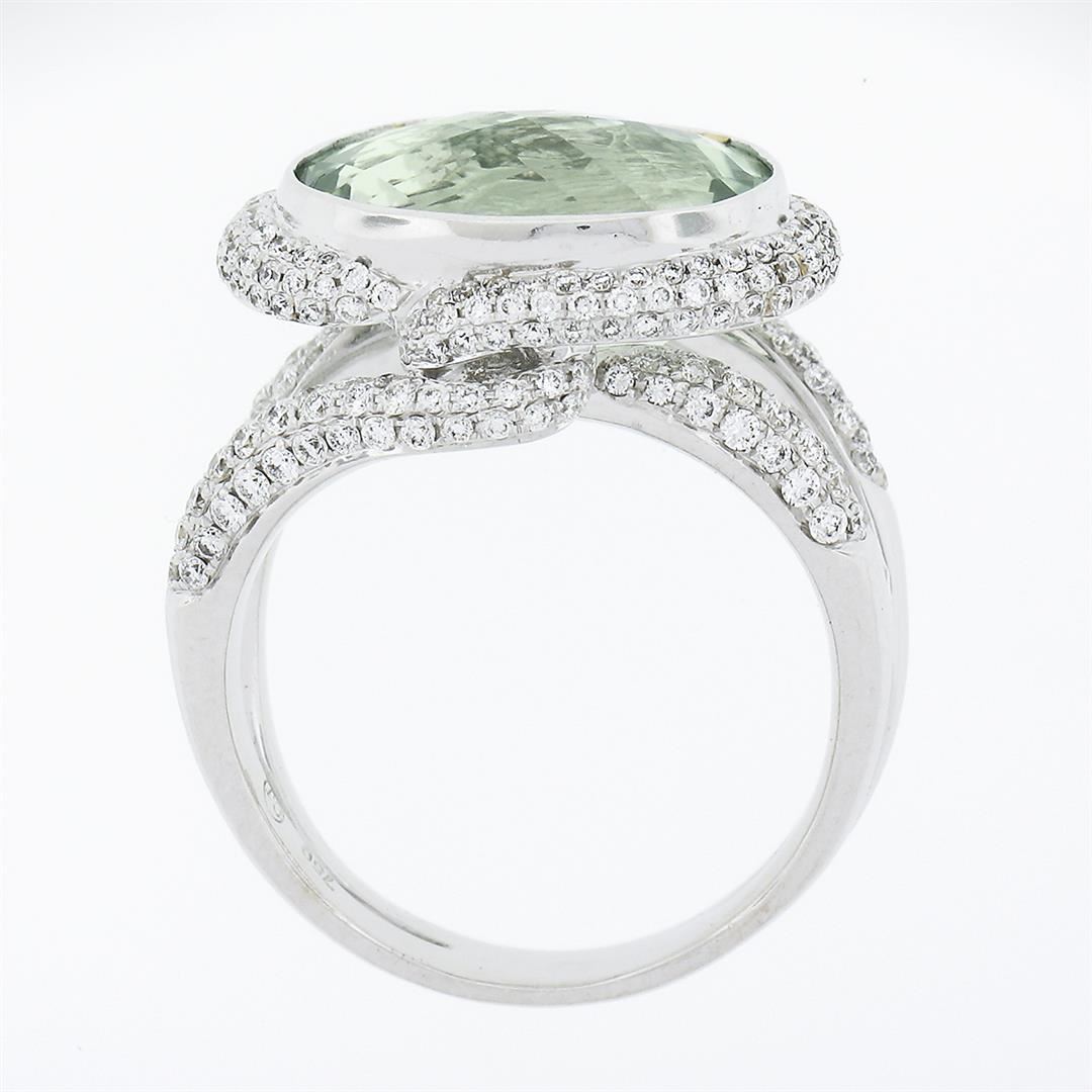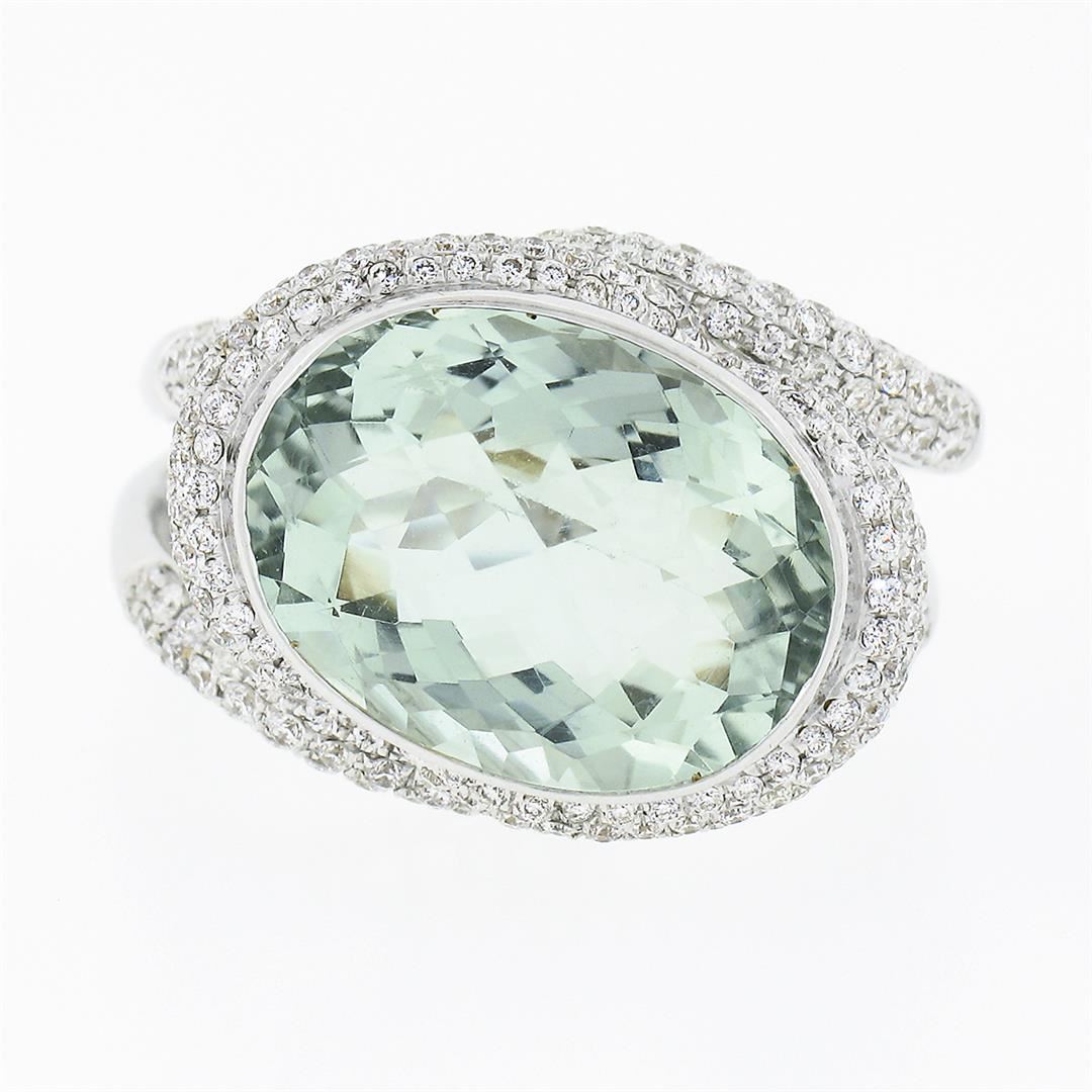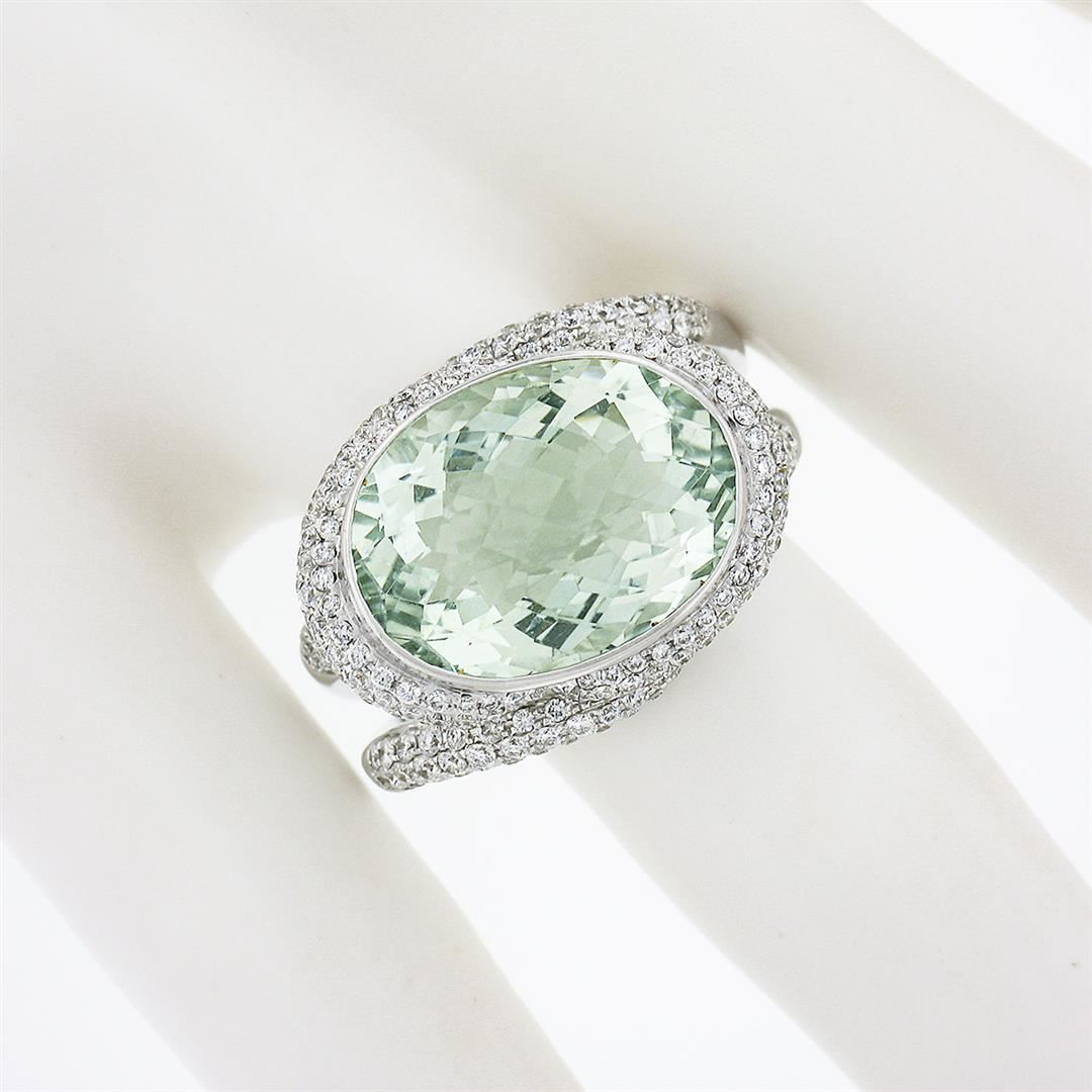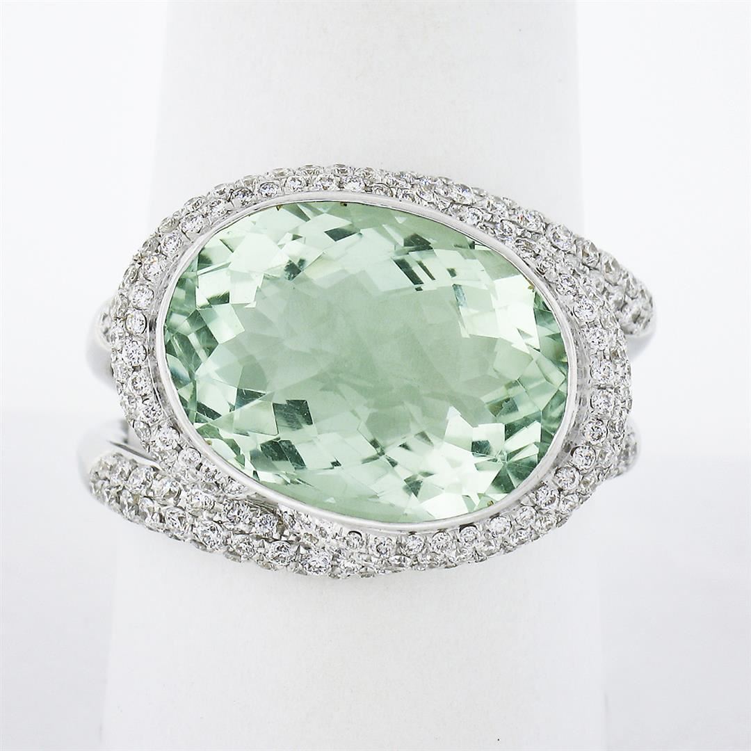 A solid 18k white gold ring, with 1 oval cut natural genuine prasiolite quartz (15.8x12.1mm), and numerous of round brilliant cut natural diamonds (F/G - VS1/VS2 ; 1.40ctw). The ring is size 9.5, weighs a total of 13.91 grams, and measures 16.40mm wide.