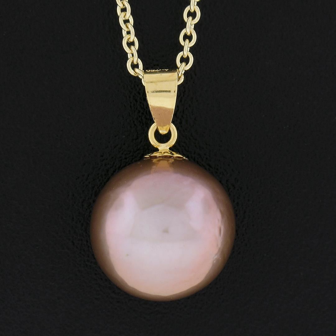 18K Yellow Gold 10.3mm Pink Pearl Solitaire Pendant 18" Cable Chain Necklace