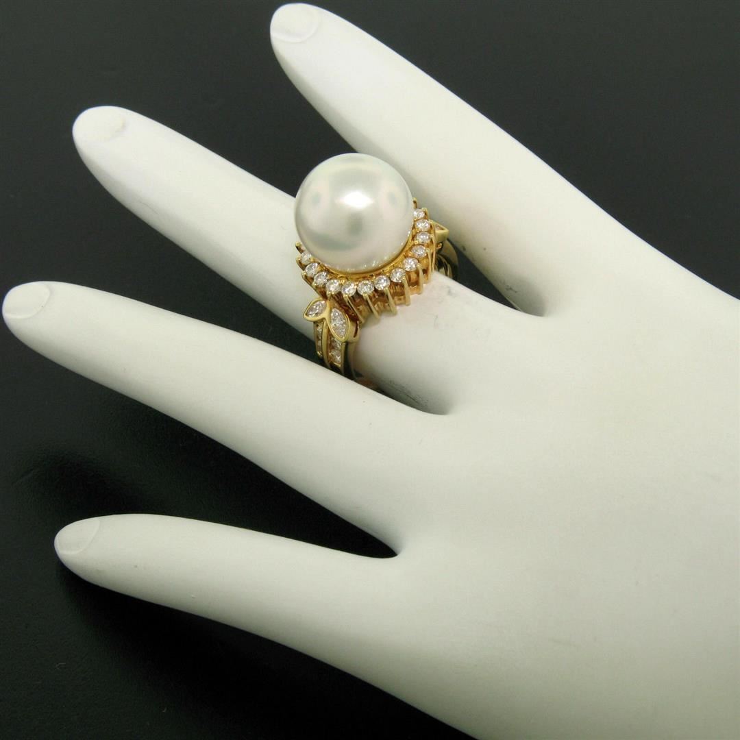 One 18K Yellow Gold LARGE 13.3mm South Sea Pearl Ring w/ 0.95ctw Round Diamond Halo. Item Details: Material: 18k Solid Yellow Gold, Weight: 11.6 Grams, Stone(s): (1) Genuine South Seas Pearl - Round Shape - White Color w/ Pink Undertones- Magnificent Luster - Nearly Perfect Surface - 13.3mm, (30) Natural Genuine Diamonds - Round Cut - Prong & Channel Set - F/G Color - VS1 Clarity - 0.65ctw (approx.), (4) Natural Genuine Diamonds - Marquise Cut - Bezel Set - F Color - VS1 Clarity - 0.30 (approx.), Total Carat Weight: 0.95 (approx.), Ring Size: 7.5 (We can custom size this ring.), Ring Width: 16mm, Ring Height: 17.15mm rise off the finger. Condition: Like New!