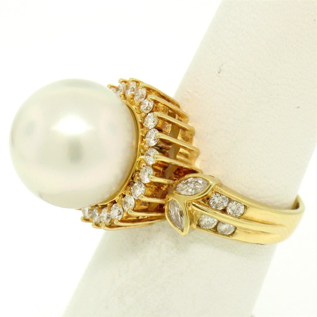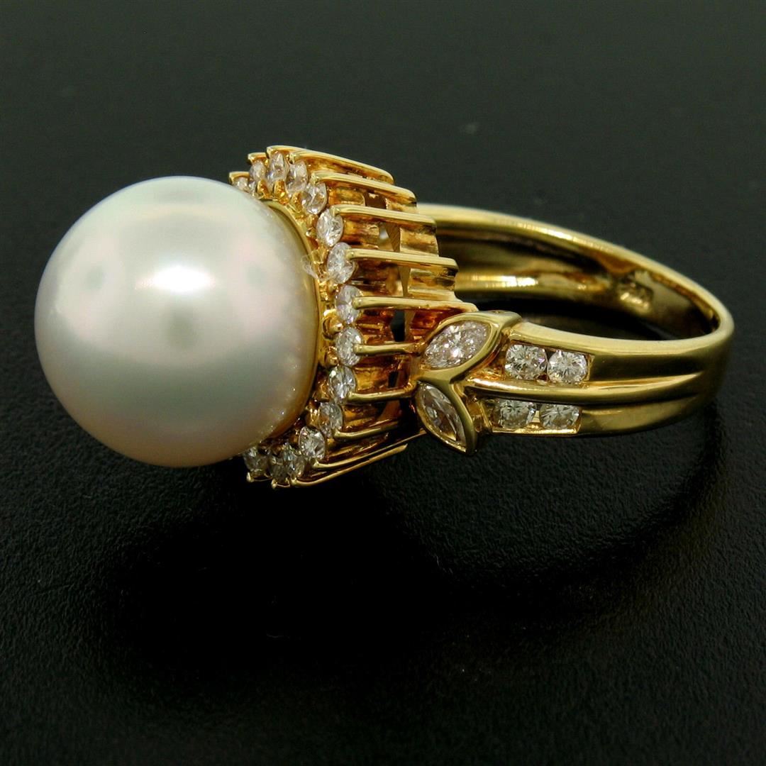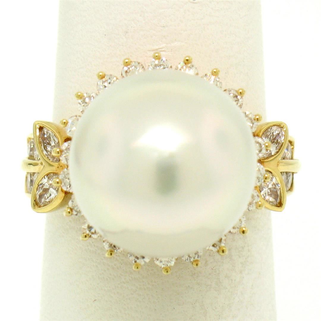 One 18K Yellow Gold LARGE 13.3mm South Sea Pearl Ring w/ 0.95ctw Round Diamond Halo. Item Details: Material: 18k Solid Yellow Gold, Weight: 11.6 Grams, Stone(s): (1) Genuine South Seas Pearl - Round Shape - White Color w/ Pink Undertones- Magnificent Luster - Nearly Perfect Surface - 13.3mm, (30) Natural Genuine Diamonds - Round Cut - Prong & Channel Set - F/G Color - VS1 Clarity - 0.65ctw (approx.), (4) Natural Genuine Diamonds - Marquise Cut - Bezel Set - F Color - VS1 Clarity - 0.30 (approx.), Total Carat Weight: 0.95 (approx.), Ring Size: 7.5 (We can custom size this ring.), Ring Width: 16mm, Ring Height: 17.15mm rise off the finger. Condition: Like New!