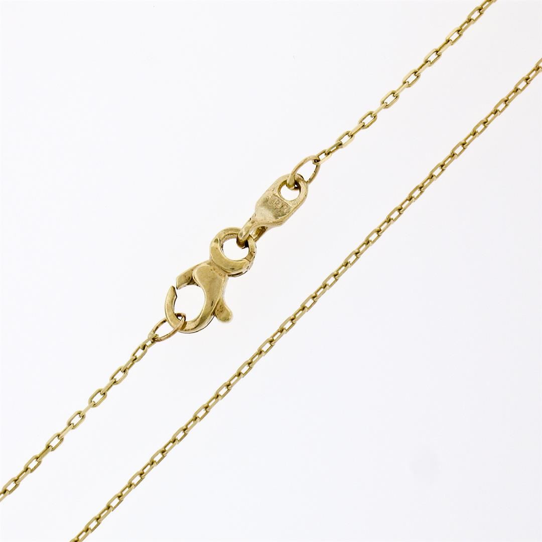 An estate solid 18k yellow gold pendant necklace, with 1 trillion cut natural tourmaline (4.75mm- 0.55ct).16 inch fine cable link chain, 5.29 grams total weight, pendant measures 24.75x11.40mm.