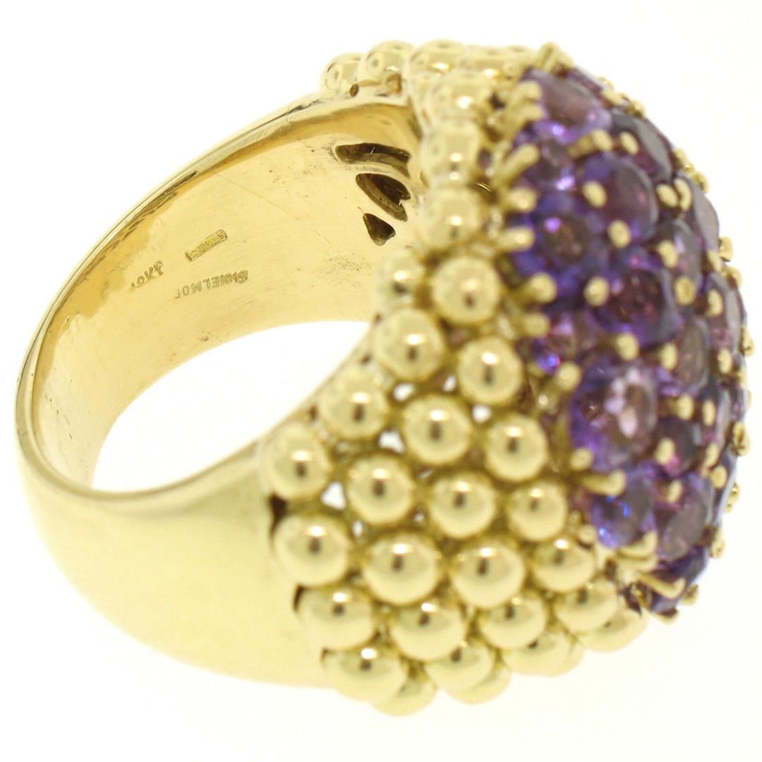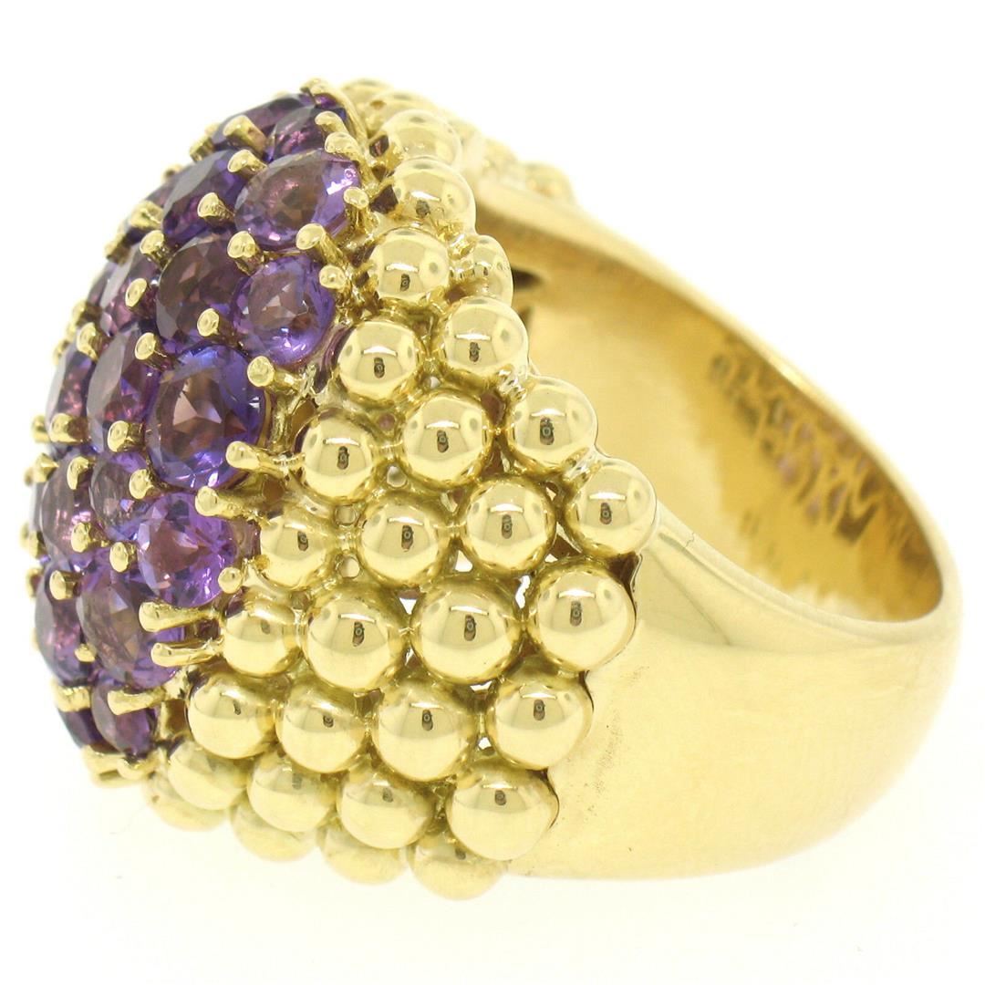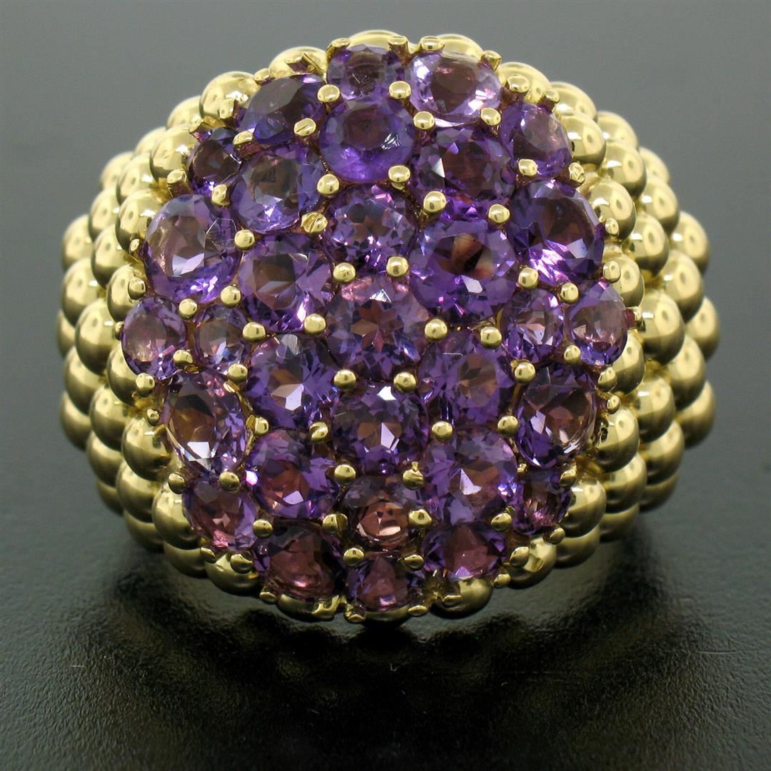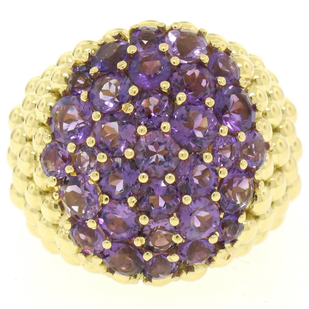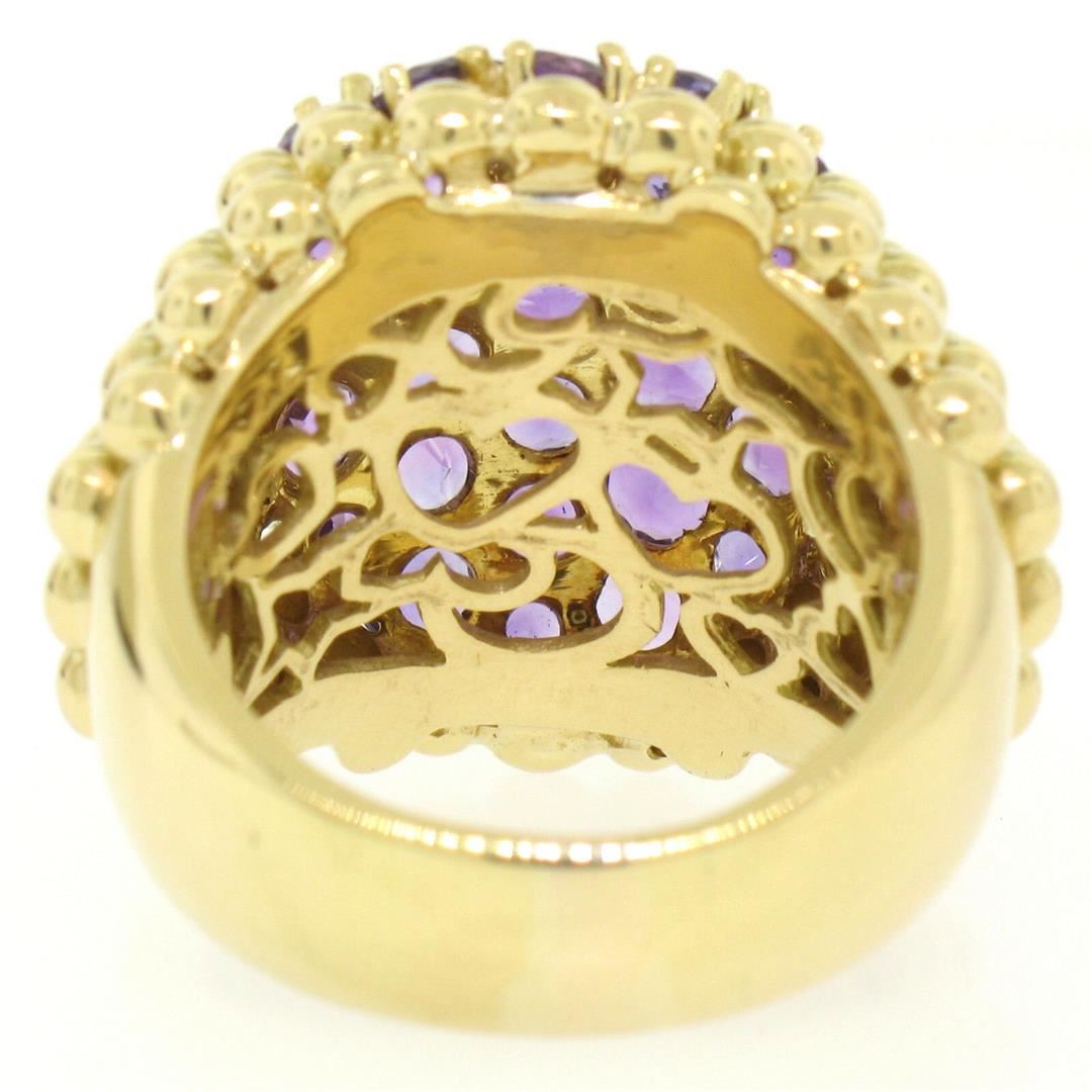 One Vintage Large 18K Yellow Gold 7.50ctw Round Amethyst Domed Popcorn Cluster Ring. Item Details: Material: 18K Solid Yellow Gold, Weight: 26.50 Grams, Stone(s): (33) Natural Genuine Amethysts - Round Brilliant Cut - Prong Set - Rich Royal Purple Color - 7.50ctw (approx.), Ring Size: 9.0, Ring Width: 24.95mm, Ring Height: 10.33mm rise off the finger, Condition: Vintage - Excellent condition.,