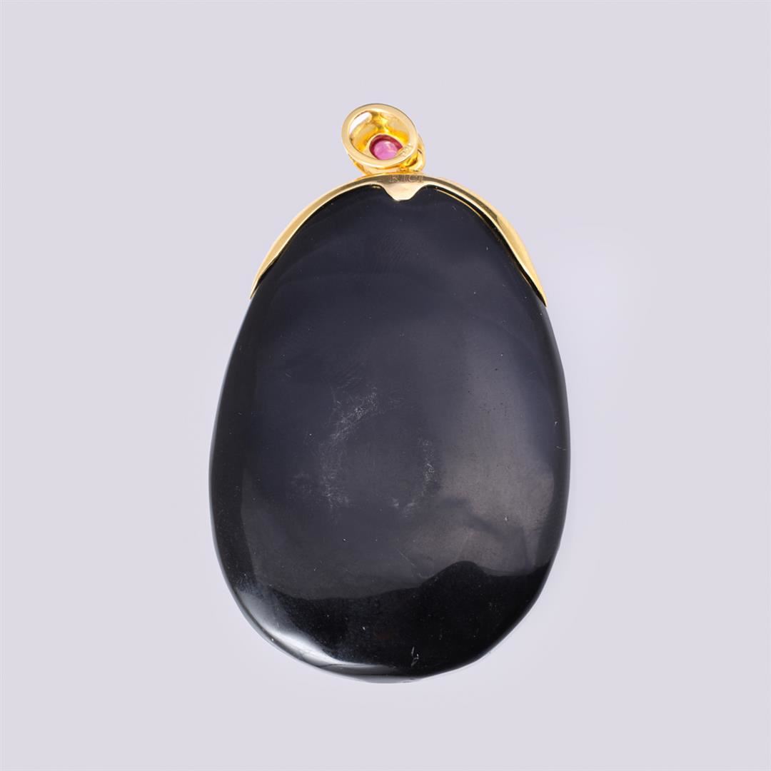18K Yellow Gold & Carved Quartz Pendant by Carlo Rici containing one oval ruby weighing approximately 0.30 cts. Total weight is 34 gm. Estimated retail value $1,800.