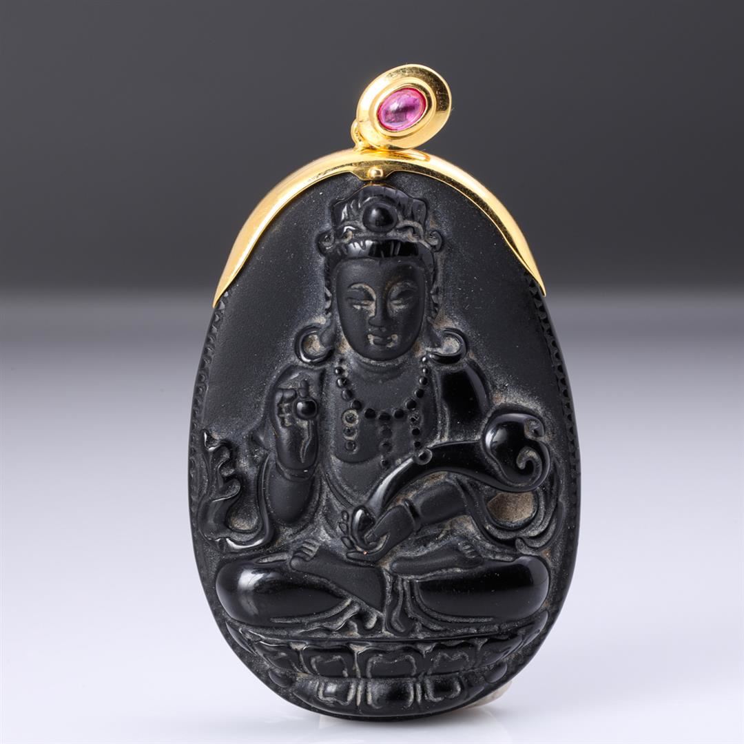 18K Yellow Gold & Carved Quartz Pendant by Carlo Rici containing one oval ruby weighing approximately 0.30 cts. Total weight is 34 gm. Estimated retail value $1,800.
