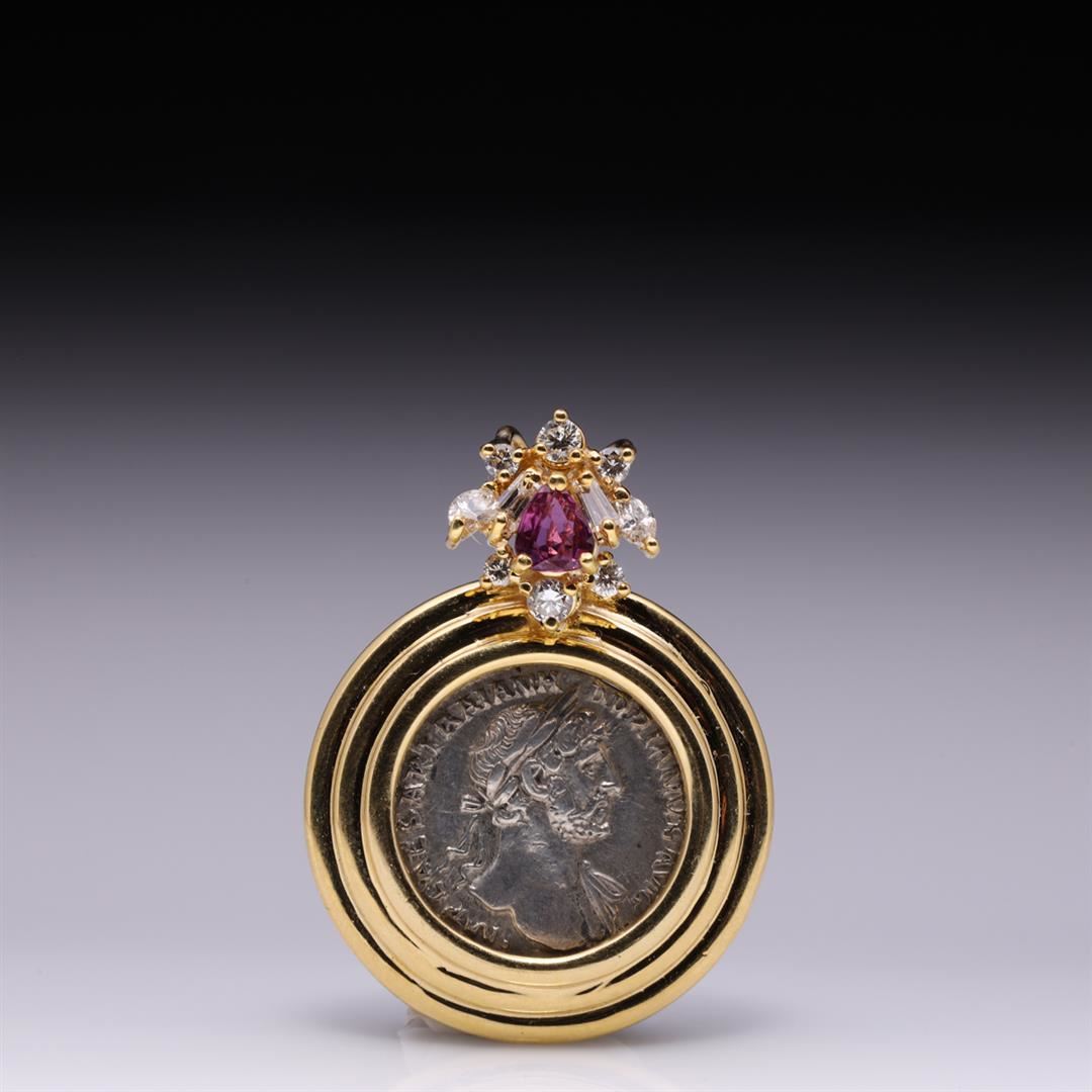18K Yellow Gold Diamond, Ruby and Silver Imperial Roman Denarius Pendant containing one pear shaped ruby weighing approximately 0.40 cts and ten diamonds weighing approximately 0.40 cts. Total weight is 11.8 gm. Estimated retail value $4,100.