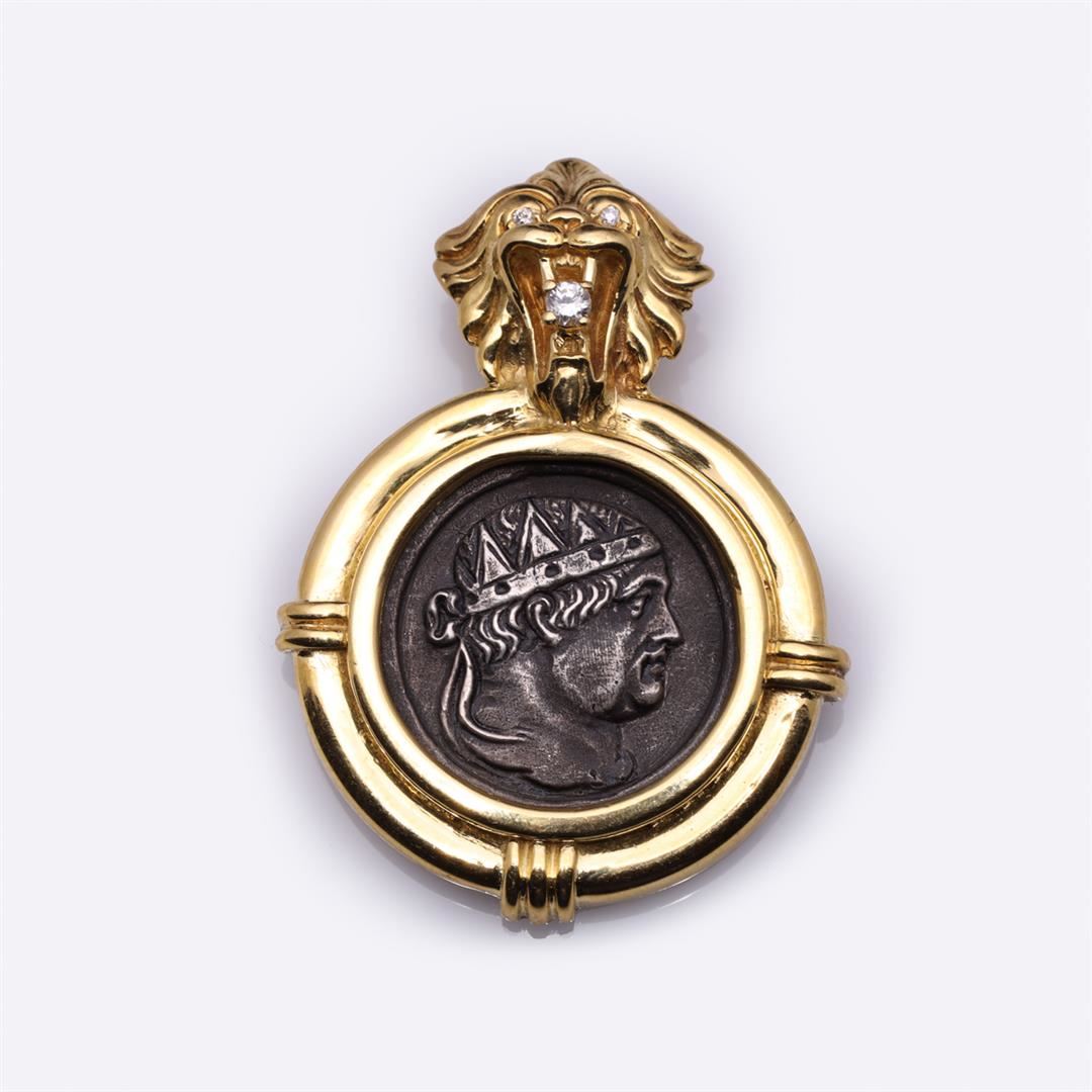 18k yellow gold pendant designed by R. L. Kay; the bale a finely detailed lion mask with diamond eyes and single claw set diamond in the lions open mouth; the center of the pendant set with silver medallion of Nero; gross weight 14.4 g, 1 1/2" x 1 1/8" (a