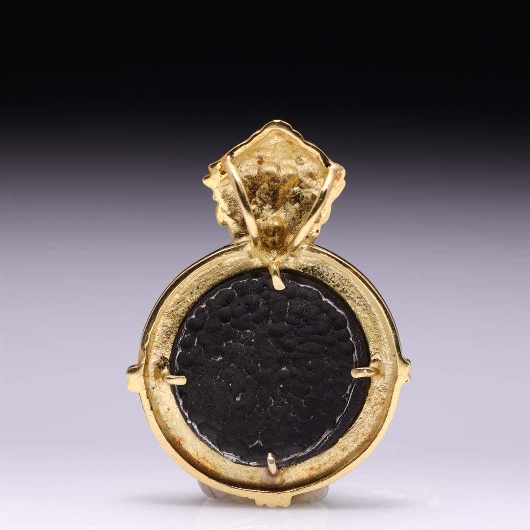 18K Yellow Gold Diamond & Silver Medallion of Nero Pendant Designed by R. L. Kay containing three diamonds weighing approximately 0.50 cts. Total weight is 14.2 gm. Estimated retail value $2,800.