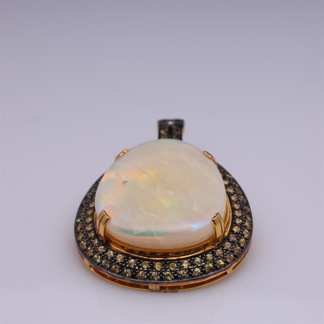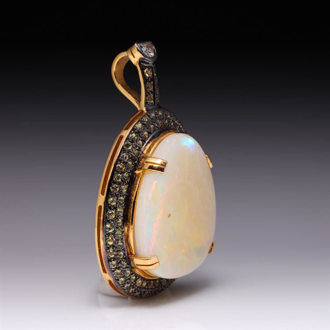 Large 18k yellow gold pendant designed by Carlo Rici; a large single Coober Pedy opal claw set surrounded by two rows of yellow sapphires on a black oxidized background continuing up the bail terminating with a white diamond, the pendant marked RICI CR 7
