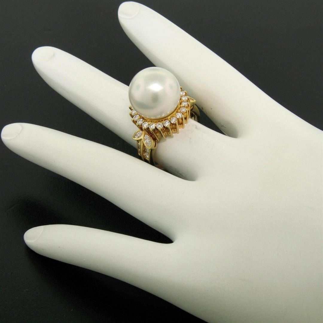 An estate solid 18k yellow gold solitaire ring featuring 1 South Seas Pearl (13.3mm) with a halo of 30 round cut natural diamonds (F/G - VS1; 0.65ctw) and 4 marquise cut naturak diamonds (F - VS1; 0.30ctw). The ring is size 7.5, weighs a total of 11.6 grams, and measures 16mm wide.