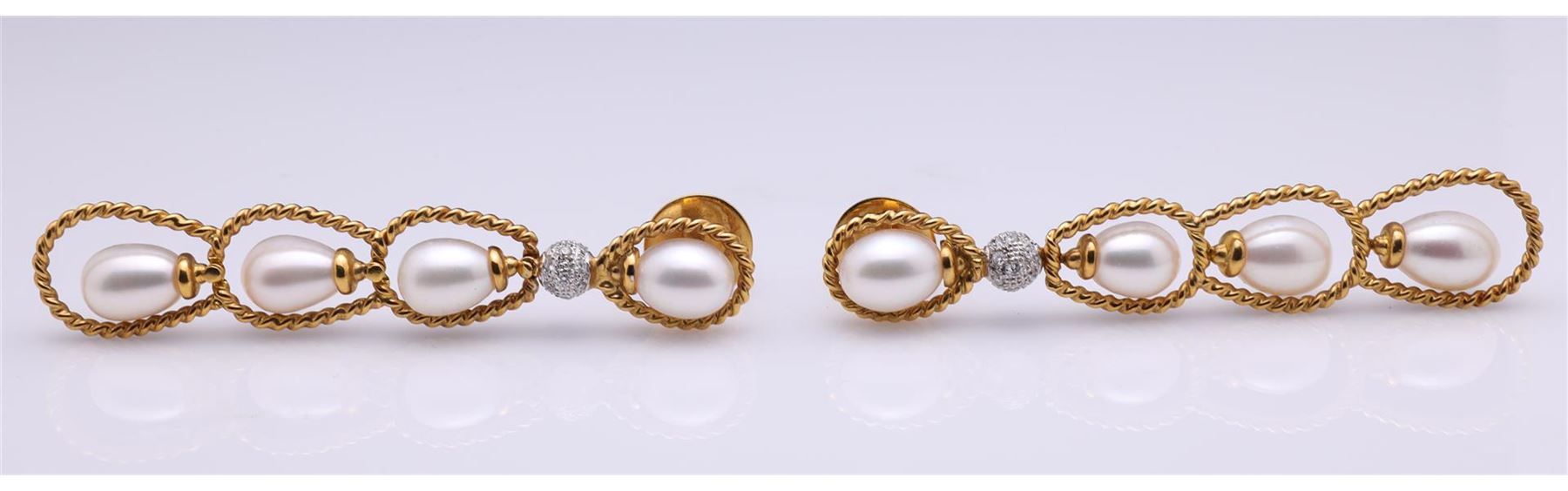 18K Yellow Gold & Pearl Earrings by Victor Loo containing thirty-two round cut brilliant diamonds weighing approximately 0.30 cts. Total weight is 18.5 gm. Estimated retail value $3,500.