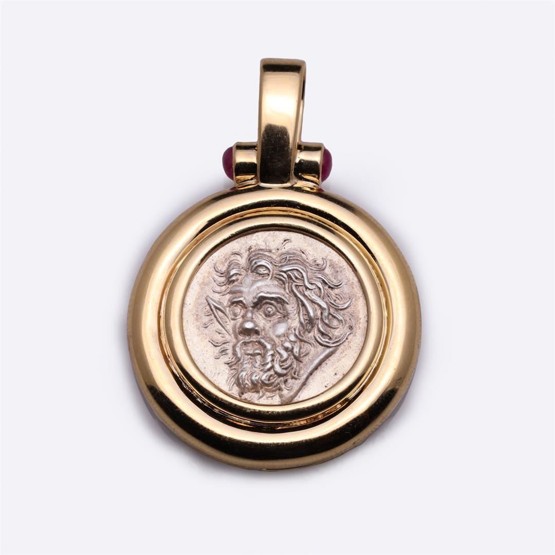 18k yellow gold pendant set with twin rubies flaking the bail and central ancient silver Greek coin depicting a male and horse on verse, the pendant marked 18k; 14.9 g, 1 5/8" x 1 1/8" (approx.)