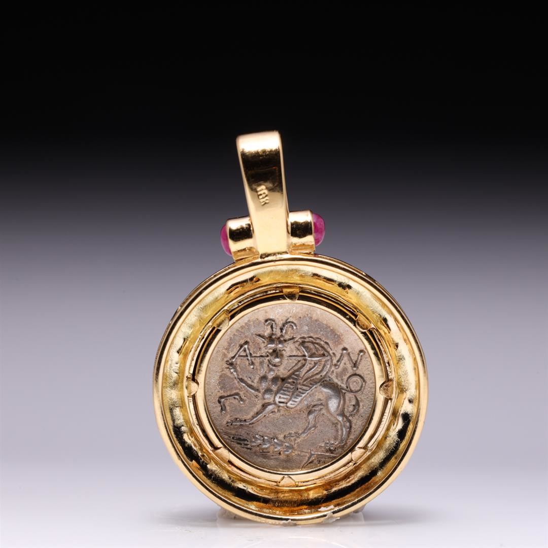 18K Yellow Gold Pendant With Rubies & Ancient Silver Greek Coin containing two cabochon rubies weighing approximately 0.20 cts. Total weight is 14.9 gm. Estimated retail value $2,800.
