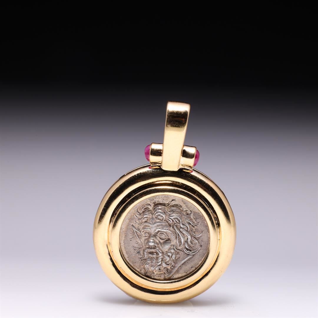 18K Yellow Gold Pendant With Rubies & Ancient Silver Greek Coin containing two cabochon rubies weighing approximately 0.20 cts. Total weight is 14.9 gm. Estimated retail value $2,800.