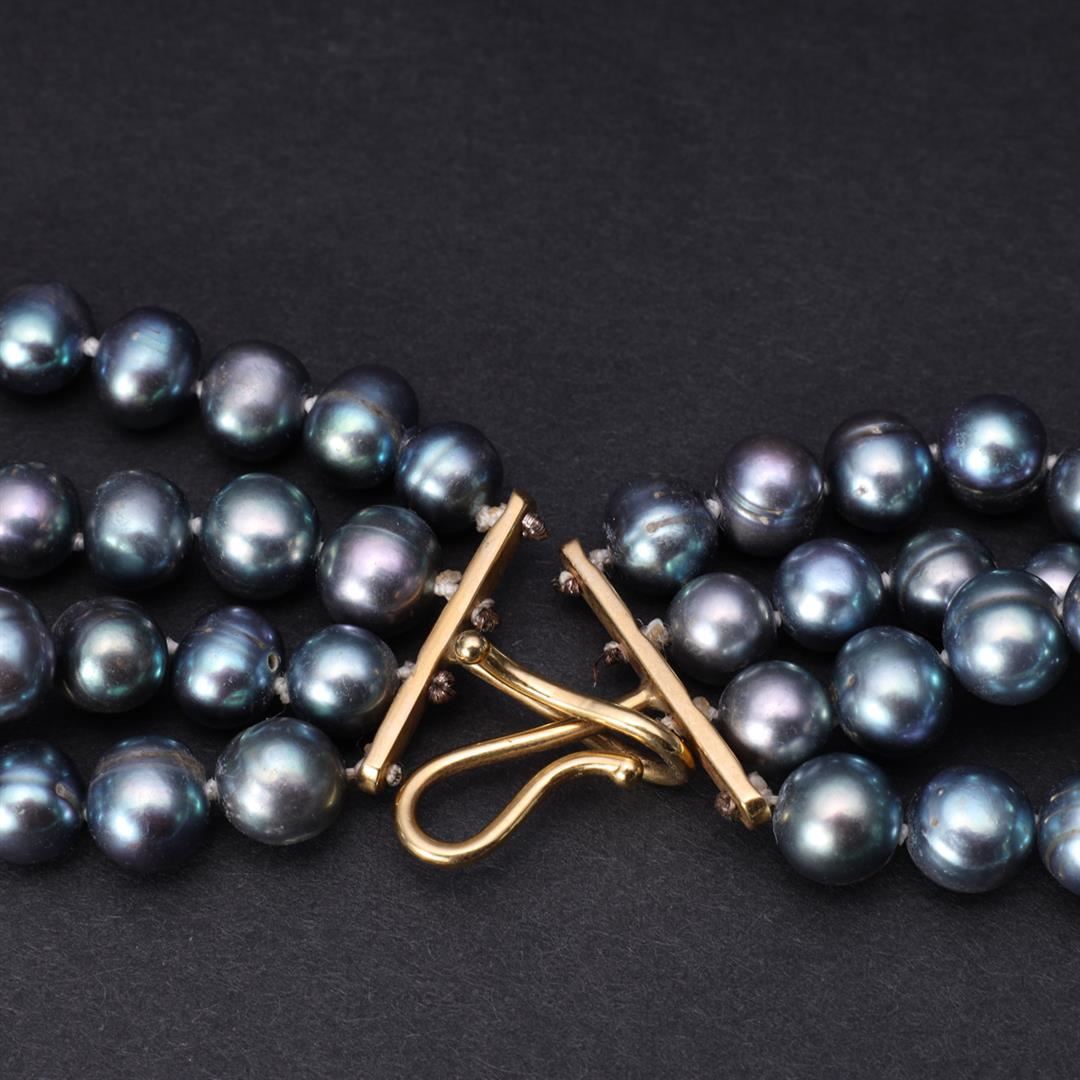 Large and heavy 18k yellow gold pendant with finely detailed dragon, ruby cabochon to base and flanked by two diamonds on four-strand black pearl choker with gold clasp gross weight 174.9 g, length 17" (approx.)