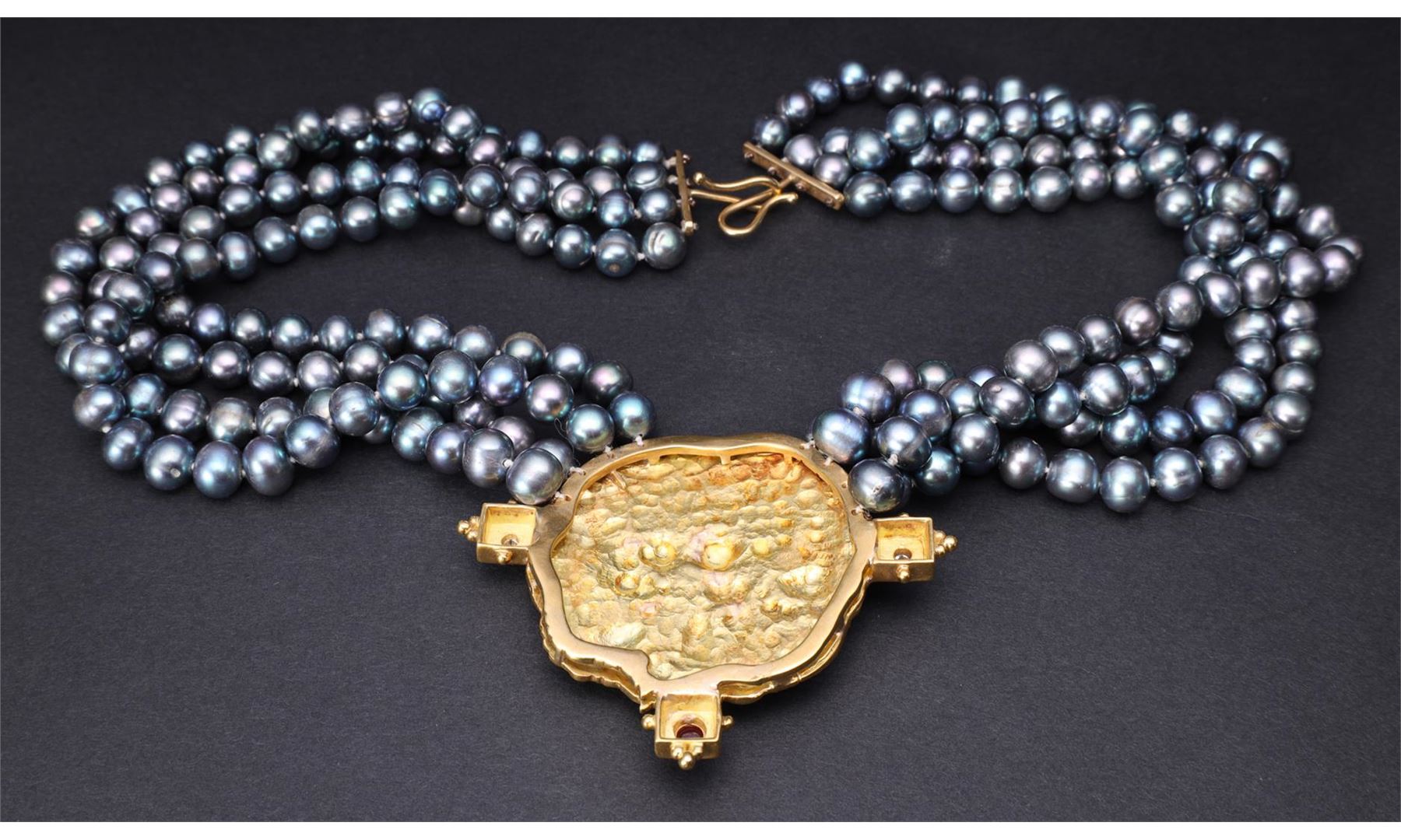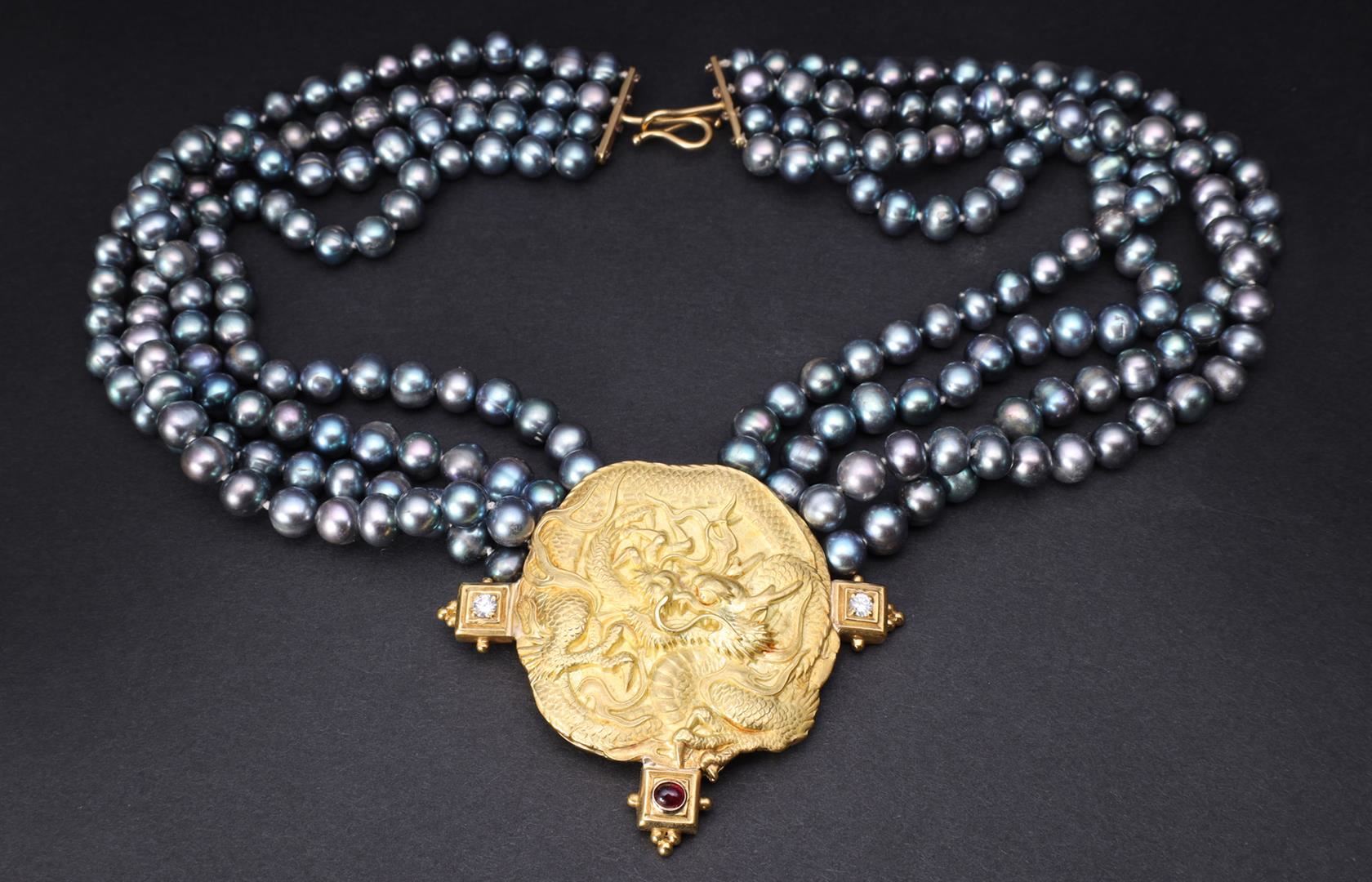 Large and heavy 18k yellow gold pendant with finely detailed dragon, ruby cabochon to base and flanked by two diamonds on four-strand black pearl choker with gold clasp gross weight 174.9 g, length 17" (approx.)