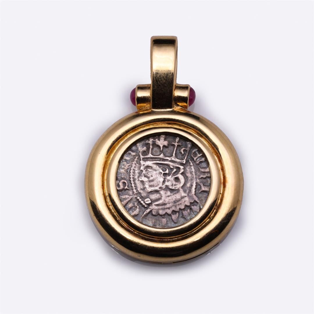 18k yellow gold pendant set with twin rubies flaking the bail and ancient silver Armenian coin to center, the coin from the reign of a Medieval Armenian Christian King who sent Knights to the Crusades, the pendant marked 18k; 11.7 g, 1 1/2" x 1" (approx.