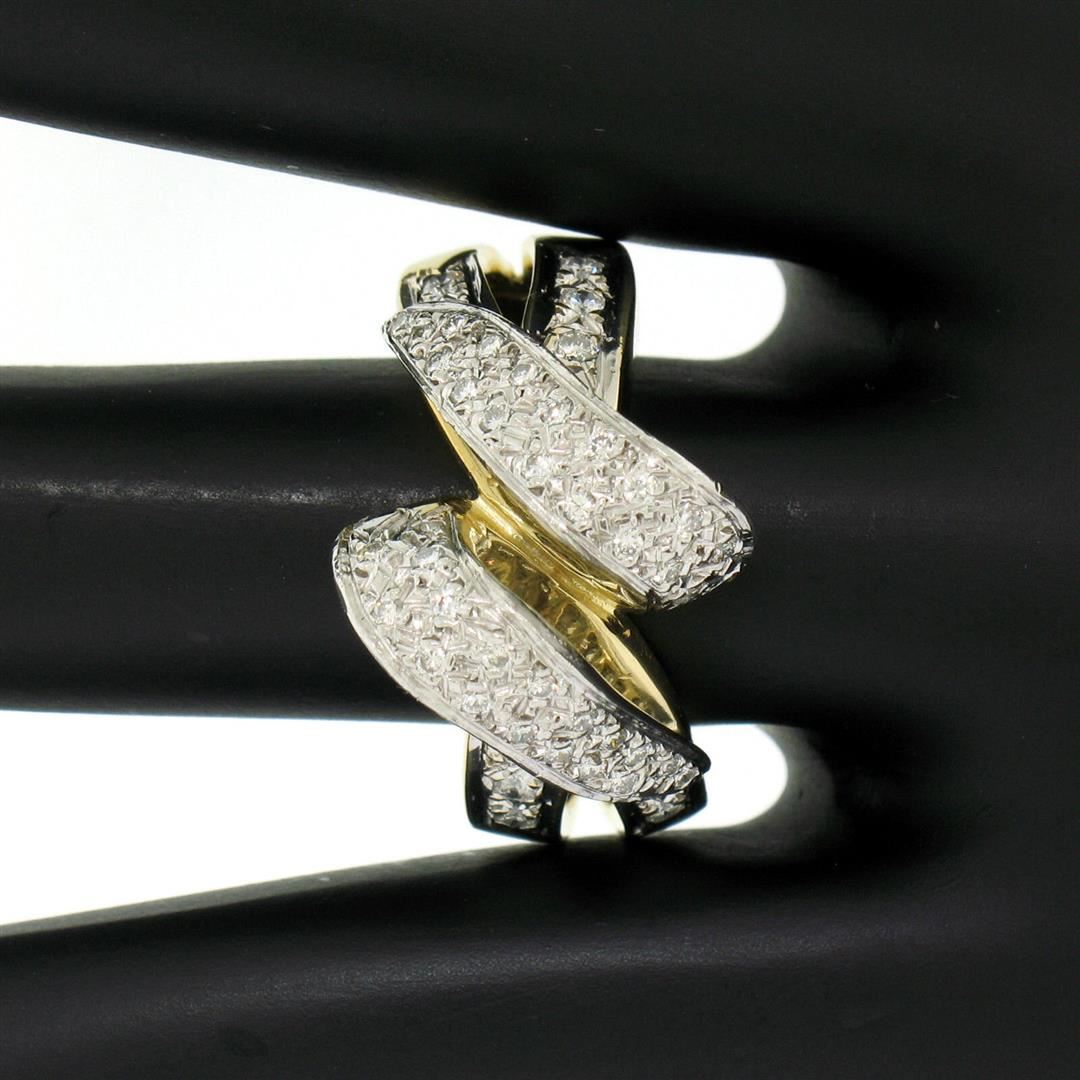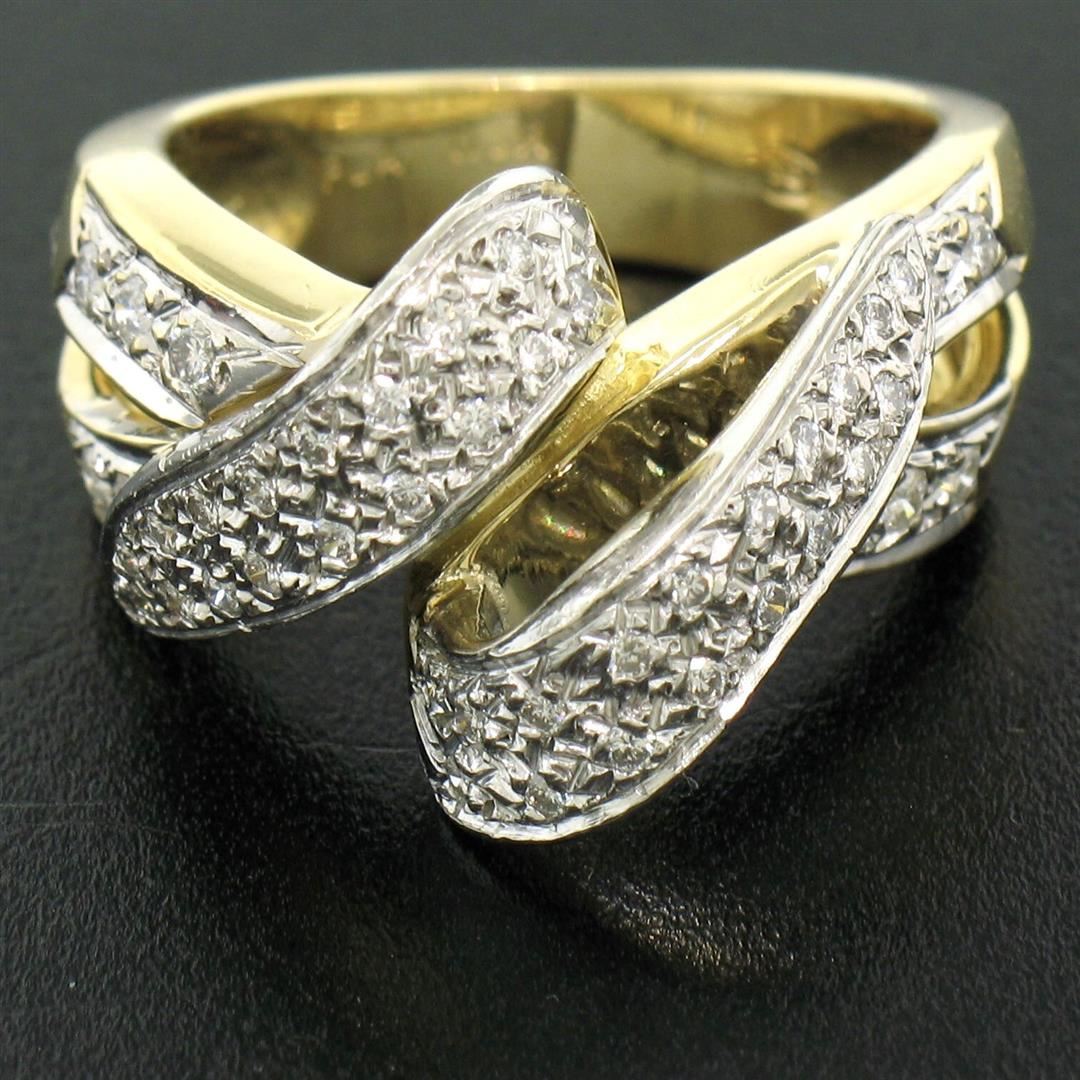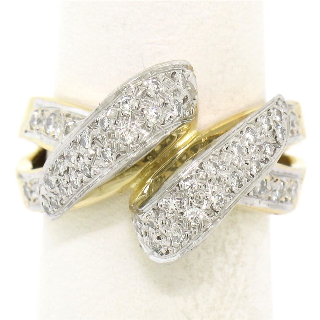 18K Yellow Gold & Platinum .46ctw Pave Set Diamond Open Swirl Cocktail Ring Sz 7. Please see photos and description for all available information. An estate solid 18k yellow gold and platinum swirl cocktail ring, with 46 round brilliant cut natural diamonds (G- VS1; 0.46ctw). The ring is size 7.0, weighs a total of 14.36 grams, and measures 15.0mm wide.