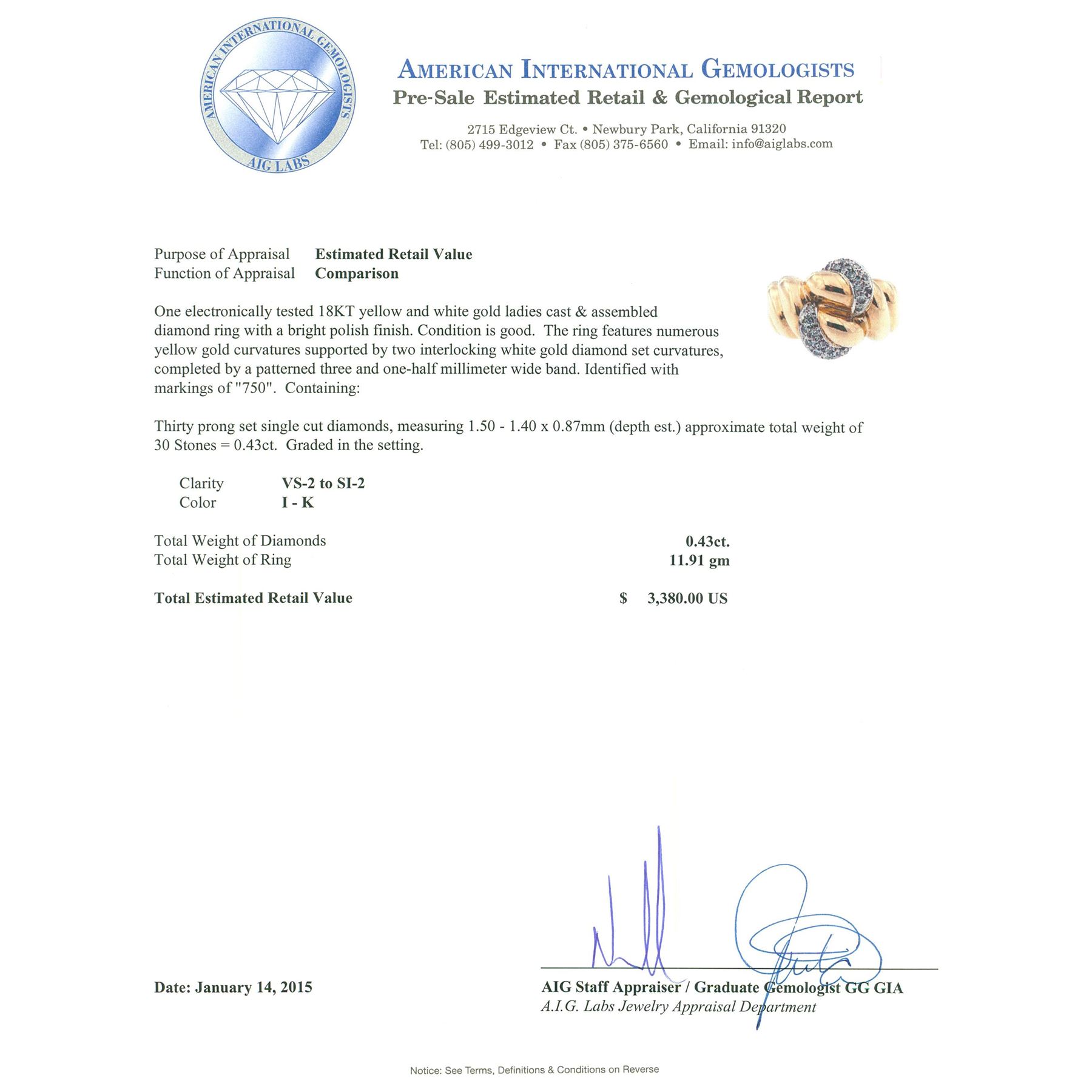 One electronically tested 18KT yellow and white gold ladies cast & assembled diamond ring with a bright polish finish. The ring features numerous yellow gold curvatures supported by two interlocking white gold diamond set curvatures, completed by a patterned three and one-half millimeter wide band. Identified with markings of "750". Condition is good. Containing: Thirty prong set single cut diamonds, measuring 1.50 - 1.40 x 0.87mm (depth est.) approximate total weight of 30 Stones = 0.43ct. Graded in the setting. Clarity: VS-2 to SI-2. Color: I - K. Total Weight of Diamonds 0.43ct. Total Weight of Ring 11.91 grams. AIG Appraised.