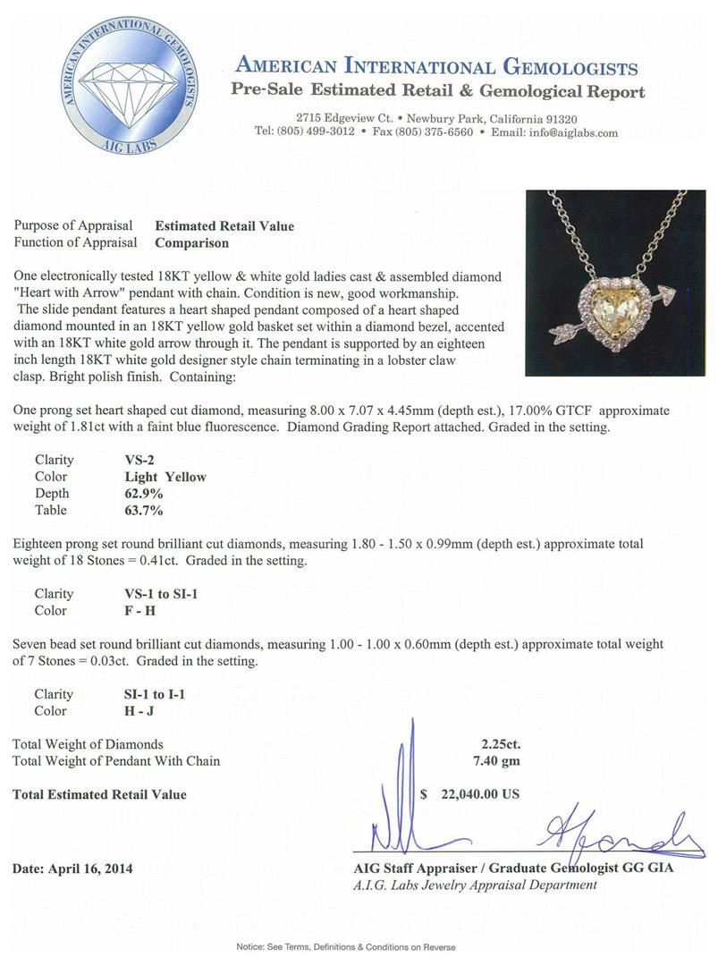 One electronically tested 18KT yellow & white gold ladies cast & assembled diamond "Heart with Arrow" pendant with chain. Condition is new, good workmanship. The slide pendant features a heart shaped pendant composed of a heart shaped diamond mounted in an 18KT yellow gold basket set within a diamond bezel, accented with an 18KT white gold arrow through it. The pendant is supported by an eighteen inch length 18KT white gold designer style chain terminating in a lobster claw clasp. Bright polish finish. Containing: One prong set heart shaped cut diamond, measuring 8.00 x 7.07 x 4.45mm (depth est.), 17.00.%. GTCF approximate weight of 1.81ct with a faint blue fluorescence. Diamond Grading Report attached. Graded in the setting. Clarity: VS-2. Depth: 62.9%. Table 63.7%. Eighteen prong set round brilliant cut diamonds, measuring 1.80 - 1.50 x 0.99mm (depth est.) approximate. Total Weight of 18 Stones = 0.41ct. Graded in the setting. Clarity: VS-1 to SI-1. Color: F - H Seven bead set round brilliant cut diamonds, measuring 1.00 - 1.00 x 0.60mm (depth est.) approximate. Total Weight of 7 Stones = 0.03ct. Graded in the setting. Clarity: SI-1 to I-1. Color: H - J. Total Weight of Diamonds 2.25ct. Total Weight of Pendant With Chain 7.40 grams. AIG Appraised.