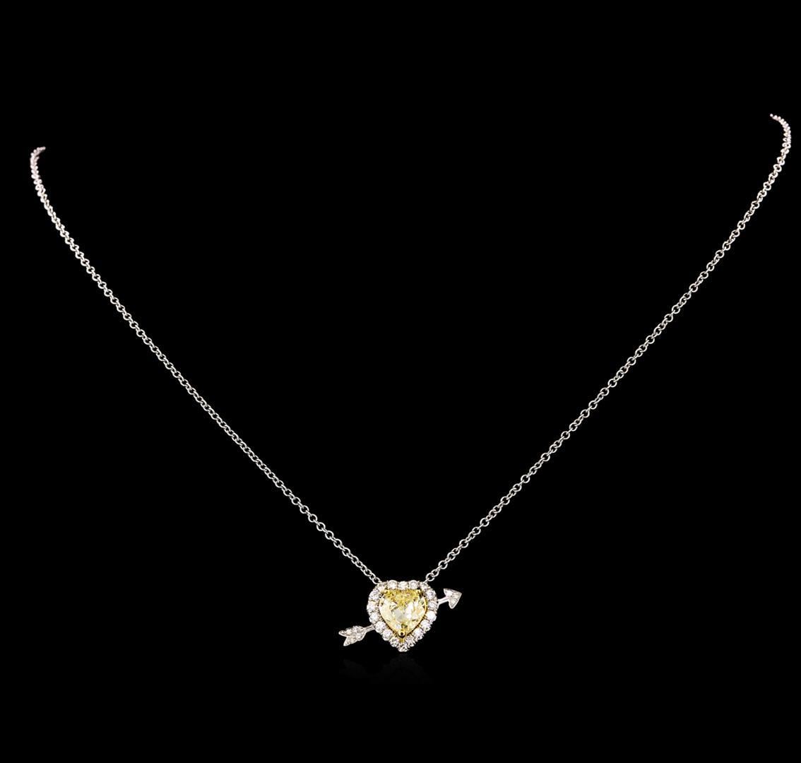 One electronically tested 18KT yellow & white gold ladies cast & assembled diamond "Heart with Arrow" pendant with chain. Condition is new, good workmanship. The slide pendant features a heart shaped pendant composed of a heart shaped diamond mounted in an 18KT yellow gold basket set within a diamond bezel, accented with an 18KT white gold arrow through it. The pendant is supported by an eighteen inch length 18KT white gold designer style chain terminating in a lobster claw clasp. Bright polish finish. Containing: One prong set heart shaped cut diamond, measuring 8.00 x 7.07 x 4.45mm (depth est.), 17.00.%. GTCF approximate weight of 1.81ct with a faint blue fluorescence. Diamond Grading Report attached. Graded in the setting. Clarity: VS-2. Depth: 62.9%. Table 63.7%. Eighteen prong set round brilliant cut diamonds, measuring 1.80 - 1.50 x 0.99mm (depth est.) approximate. Total Weight of 18 Stones = 0.41ct. Graded in the setting. Clarity: VS-1 to SI-1. Color: F - H Seven bead set round brilliant cut diamonds, measuring 1.00 - 1.00 x 0.60mm (depth est.) approximate. Total Weight of 7 Stones = 0.03ct. Graded in the setting. Clarity: SI-1 to I-1. Color: H - J. Total Weight of Diamonds 2.25ct. Total Weight of Pendant With Chain 7.40 grams. AIG Appraised.