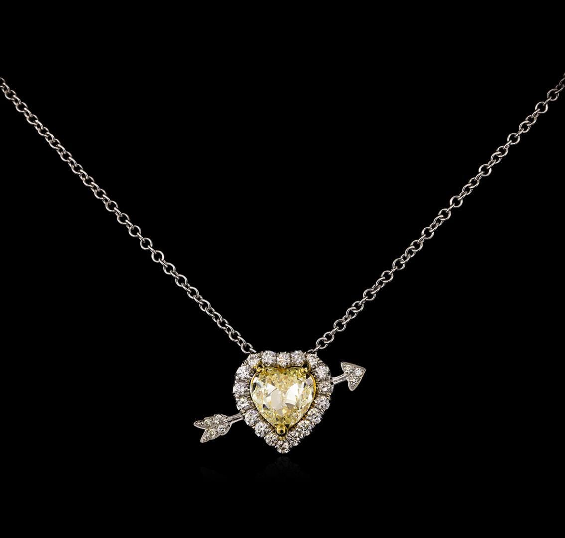 One electronically tested 18KT yellow & white gold ladies cast & assembled diamond "Heart with Arrow" pendant with chain. Condition is new, good workmanship. The slide pendant features a heart shaped pendant composed of a heart shaped diamond mounted in an 18KT yellow gold basket set within a diamond bezel, accented with an 18KT white gold arrow through it. The pendant is supported by an eighteen inch length 18KT white gold designer style chain terminating in a lobster claw clasp. Bright polish finish. Containing: One prong set heart shaped cut diamond, measuring 8.00 x 7.07 x 4.45mm (depth est.), 17.00.%. GTCF approximate weight of 1.81ct with a faint blue fluorescence. Diamond Grading Report attached. Graded in the setting. Clarity: VS-2. Depth: 62.9%. Table 63.7%. Eighteen prong set round brilliant cut diamonds, measuring 1.80 - 1.50 x 0.99mm (depth est.) approximate. Total Weight of 18 Stones = 0.41ct. Graded in the setting. Clarity: VS-1 to SI-1. Color: F - H Seven bead set round brilliant cut diamonds, measuring 1.00 - 1.00 x 0.60mm (depth est.) approximate. Total Weight of 7 Stones = 0.03ct. Graded in the setting. Clarity: SI-1 to I-1. Color: H - J. Total Weight of Diamonds 2.25ct. Total Weight of Pendant With Chain 7.40 grams. AIG Appraised.