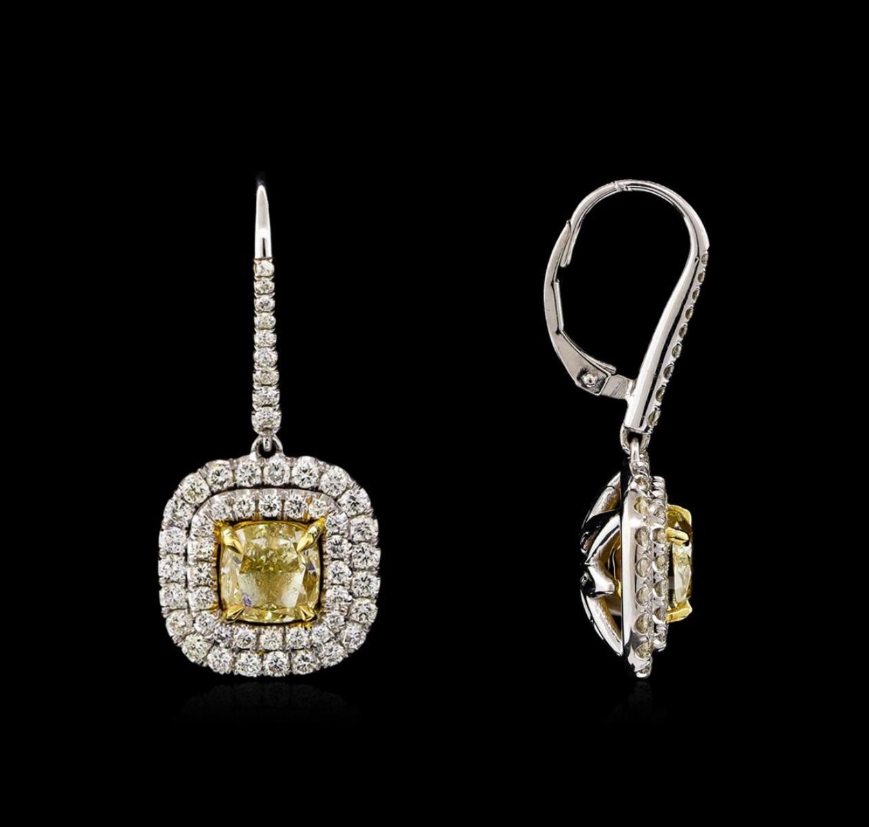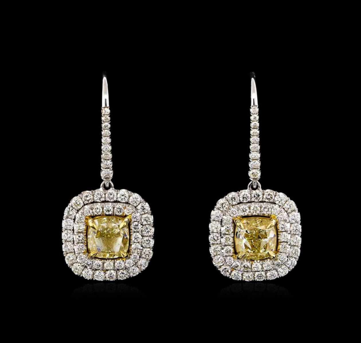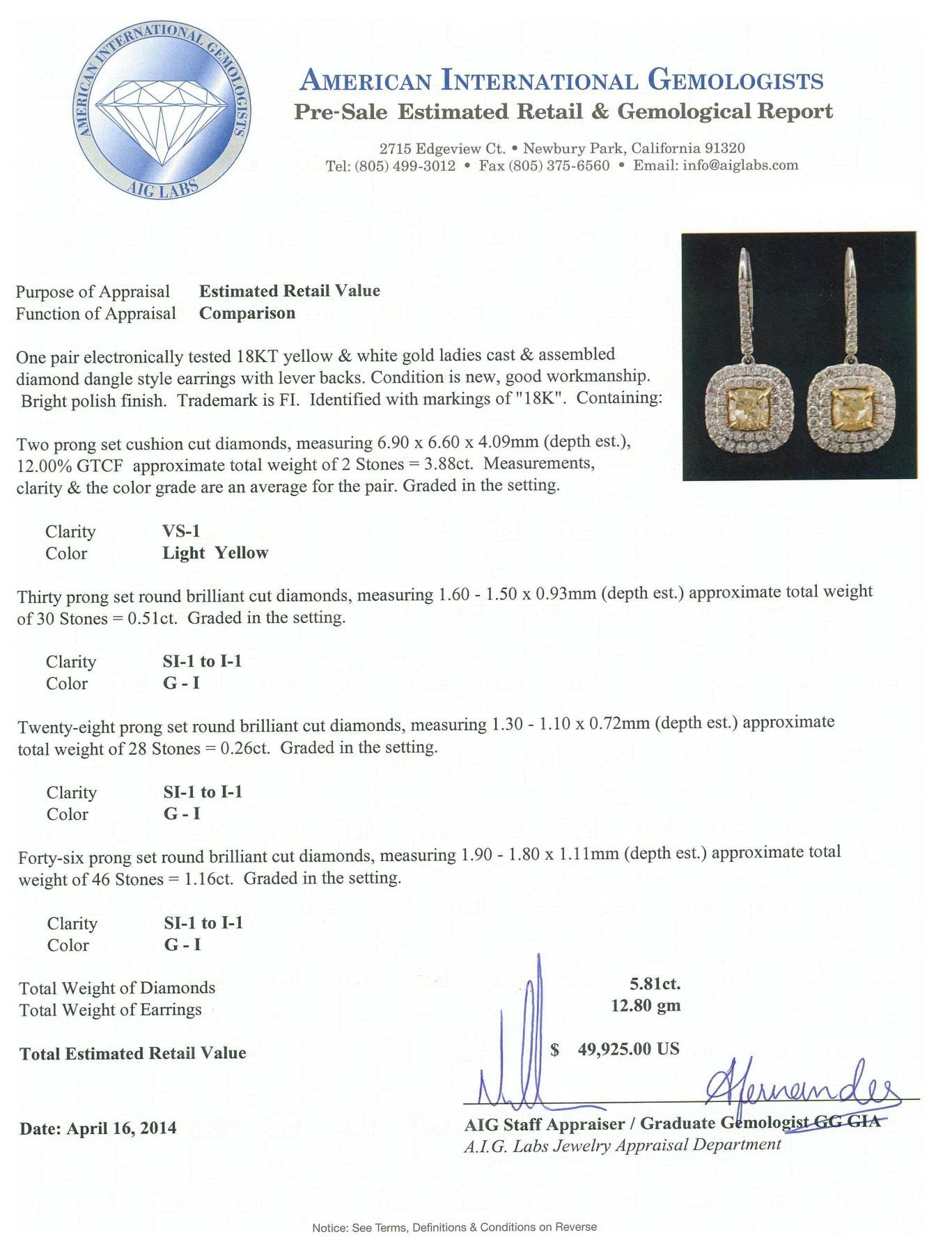 One pair electronically tested 18KT yellow & white gold ladies cast & assembled diamond dangle style earrings with lever backs. Condition is new, good workmanship. Bright polish finish. Trademark is FI. Identified with markings of "18K". Containing: Two prong set cushion cut diamonds, measuring 6.90 x 6.60 x 4.09mm (depth est.), 12.00.%. GTCF approximate. Total Weight of 2 Stones = 3.88ct. Measurements, clarity & the color grade are an average for the pair. Graded in the setting. Clarity: VS-1 Thirty prong set round brilliant cut diamonds, measuring 1.60 - 1.50 x 0.93mm (depth est.) approximate. Total Weight of 30 Stones = 0.51ct. Graded in the setting. Clarity: SI-1 to I-1. Color: G - I Twenty-Eight prong set round brilliant cut diamonds, measuring 1.30 - 1.10 x 0.72mm (depth est.) approximate. Total Weight of 28 Stones = 0.26ct. Graded in the setting. Clarity: SI-1 to I-1. Color: G - I Forty-Six prong set round brilliant cut diamonds, measuring 1.90 - 1.80 x 1.11mm (depth est.) approximate. Total Weight of 46 Stones = 1.16ct. Graded in the setting. Clarity: SI-1 to I-1. Color: G - I. Total Weight of Diamonds 5.81ct. Total Weight of Earrings 12.80 grams. AIG Appraised at $49,925.00.