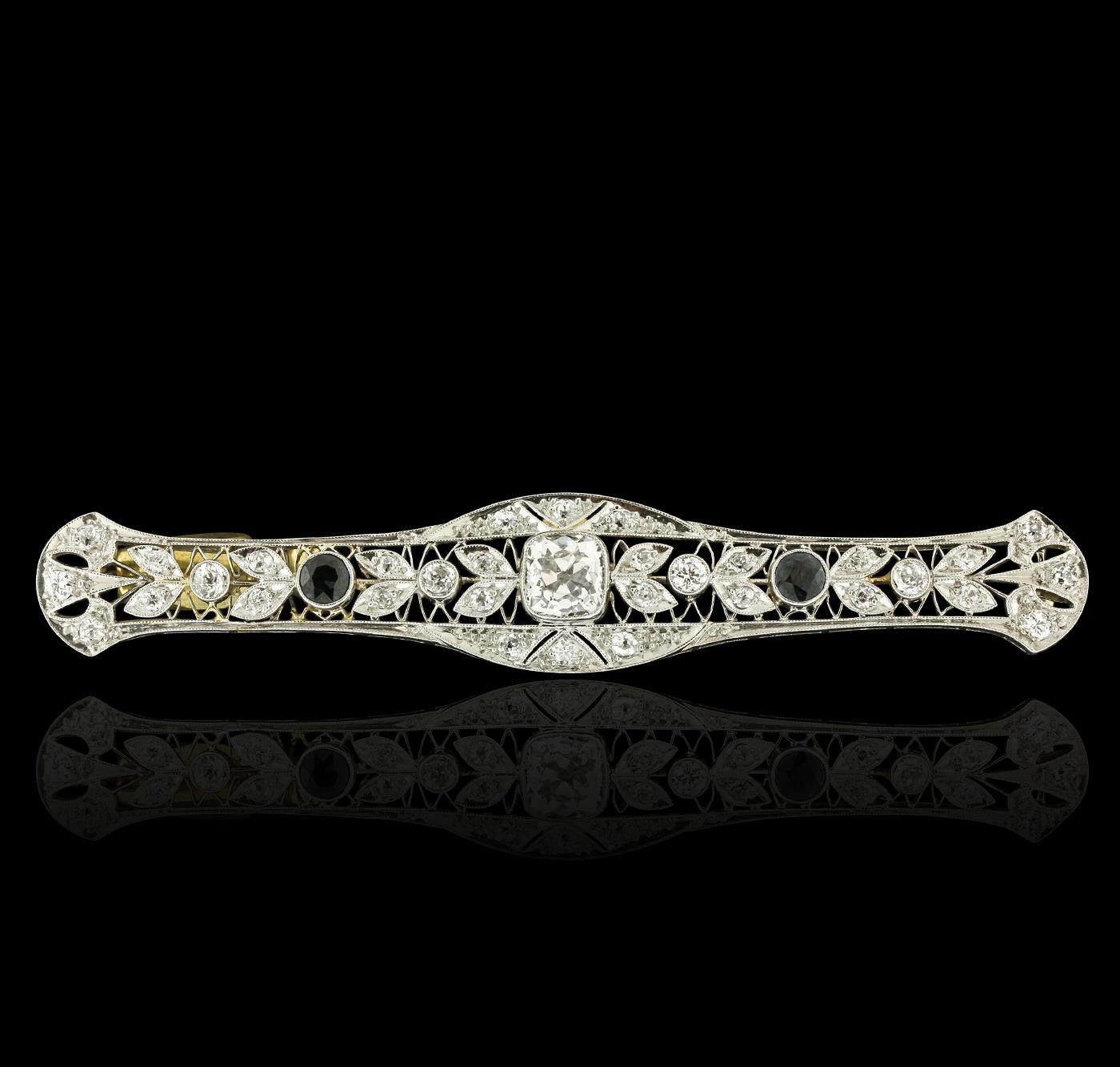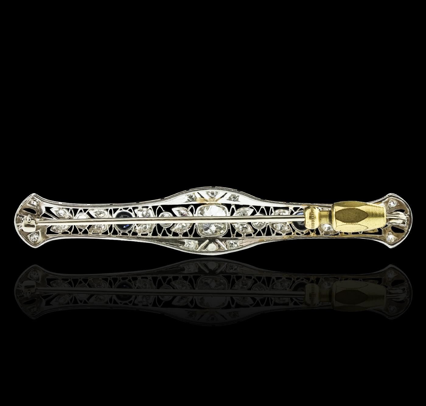 One electronically tested 18KT white gold ladies cast & assembled diamond and sapphire brooch. The brooch is completed by a horizontally placed pin. Bright polish finish with milgrain detailing throughout. Area measurements 3.00 x 0.50 inches. The brooch is reminiscent of the jewelry designs from the Art Deco Period. The Paris Exposition of Decorative Arts and Modern Manufacturers in 1925 gave the movement its name. The Art Deco Period is characterized with jewelry designs composed of bold geometric designs, & cubism. Condition is good. Containing: One bezel set cushion cut diamond, measuring 6.20 x 5.70 x 4.20mm (depth est.) approximate weight of 1.25ct. Cutting style circa early 20th century. Graded in the setting. Clarity: SI-1. Color: H Four bezel set Old European cut diamonds, measuring 2.80 - 2.70 x 1.80mm (depth est.) approximate total weight of 4 Stones = 0.40ct. Cutting style circa early and late 19th century. Graded in the setting. Clarity: SI-2 to I-1. Color: H - I Twenty-Eight bead set Old European cut diamonds, measuring 1.90 - 1.70 x 1.12mm (depth est.) approximate total weight of 28 Stones = 0.72ct. Cutting style circa early and late 19th century. Graded in the setting. Clarity: SI-1 to I-1. Color: H - I Two prong set round brilliant cut natural blue sapphires, measuring 3.80 - 3.70 x 2.20 mm, approximate total weight of 0.60ct., clarity is eye clean, type II, dark, very slightly grayish, very slightly greenish blue color, (GIA vslgB 7/3), cut is good. Transmitting light with no distortion, transparent. Color grade is an average for the pair. Graded in the setting. Total Weight of Colored Stones 0.60ct. Total Weight of Diamonds 2.37ct. Total Weight of Brooch 8.84 grams. AIG Appraised at $23,470.00.