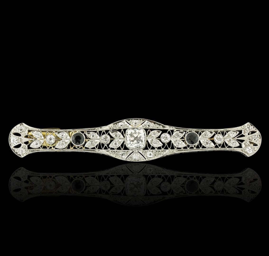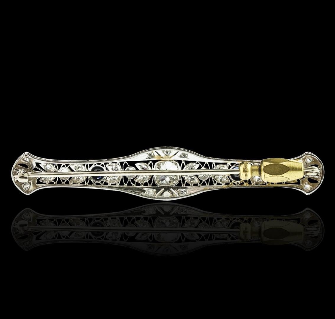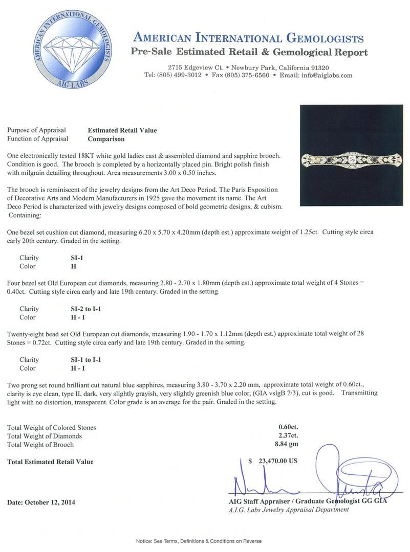 One electronically tested 18KT white gold ladies cast & assembled diamond and sapphire brooch. The brooch is completed by a horizontally placed pin. Bright polish finish with milgrain detailing throughout. Area measurements 3.00 x 0.50 inches. The brooch is reminiscent of the jewelry designs from the Art Deco Period. The Paris Exposition of Decorative Arts and Modern Manufacturers in 1925 gave the movement its name. The Art Deco Period is characterized with jewelry designs composed of bold geometric designs, & cubism. Condition is good. Containing: One bezel set cushion cut diamond, measuring 6.20 x 5.70 x 4.20mm (depth est.) approximate weight of 1.25ct. Cutting style circa early 20th century. Graded in the setting. Clarity: SI-1. Color: H Four bezel set Old European cut diamonds, measuring 2.80 - 2.70 x 1.80mm (depth est.) approximate total weight of 4 Stones = 0.40ct. Cutting style circa early and late 19th century. Graded in the setting. Clarity: SI-2 to I-1. Color: H - I Twenty-Eight bead set Old European cut diamonds, measuring 1.90 - 1.70 x 1.12mm (depth est.) approximate total weight of 28 Stones = 0.72ct. Cutting style circa early and late 19th century. Graded in the setting. Clarity: SI-1 to I-1. Color: H - I Two prong set round brilliant cut natural blue sapphires, measuring 3.80 - 3.70 x 2.20 mm, approximate total weight of 0.60ct., clarity is eye clean, type II, dark, very slightly grayish, very slightly greenish blue color, (GIA vslgB 7/3), cut is good. Transmitting light with no distortion, transparent. Color grade is an average for the pair. Graded in the setting. Total Weight of Colored Stones 0.60ct. Total Weight of Diamonds 2.37ct. Total Weight of Brooch 8.84 grams. AIG Appraised.