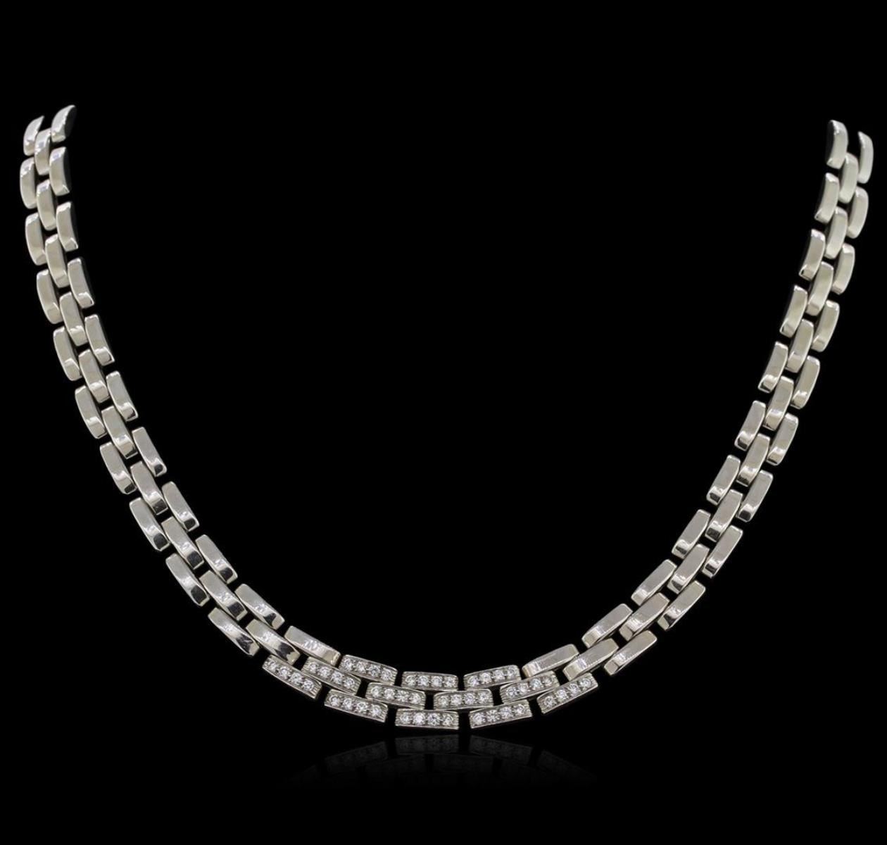 One electronically tested 18KT white gold ladies cast diamond necklace with a hidden box clasp with a bright polish finish. Measurements: 16" in length Identified with markings of "750". Condition is very good. Containing: Forty-Eight prong set round brilliant cut diamonds, measuring 1.60 - 1.60 x 0.96mm (depth est.) approximate total weight of 48 Stones = 0.72ct. Clarity: VS-2 to SI-1. Color: G - H, Cut is Good. All diamonds are graded in the mounting, unless otherwise stated. Total Weight of Diamonds 0.72ct. Total Weight of Necklace 73.20 grams. GGL Appraised.