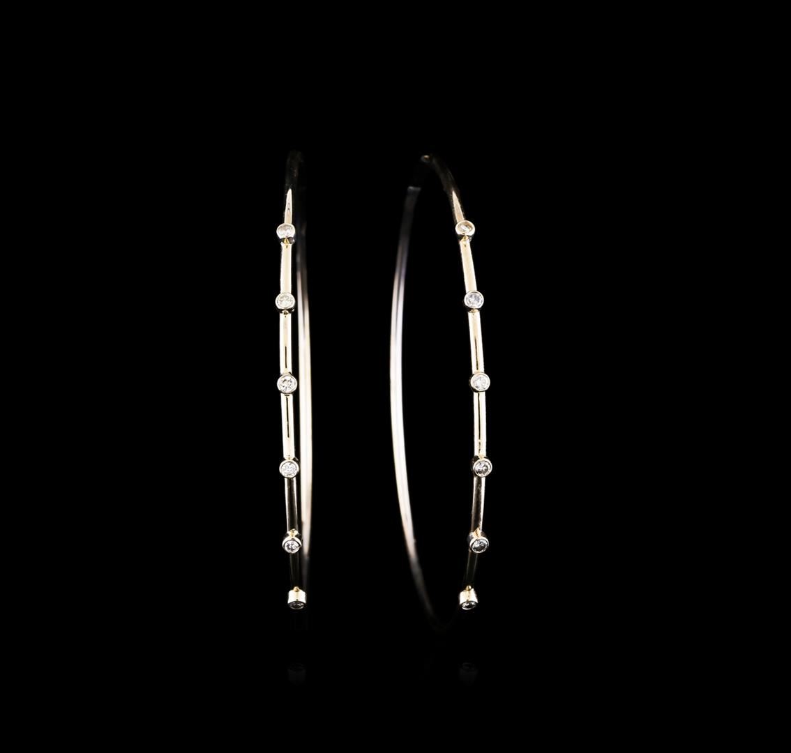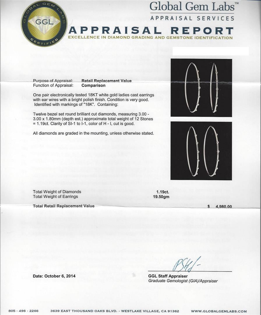 One pair electronically tested 18KT white gold ladies cast earrings with a hidden box clasp with a bright polish finish. Identified with markings of "18K". Condition is very good. Containing: Twelve bezel set round brilliant cut diamonds, measuring 3.00 - 3.00 x 1.80mm (depth est.) approximate total weight of 12 Stones = 1.19ct. Clarity: SI-1 to I-1. Color: H - I, Cut is Good. All diamonds are graded in the mounting, unless otherwise stated. Total Weight of Diamonds 1.19ct. Total Weight of earrings 19.50 grams. GGL Appraised at $4,980.00.