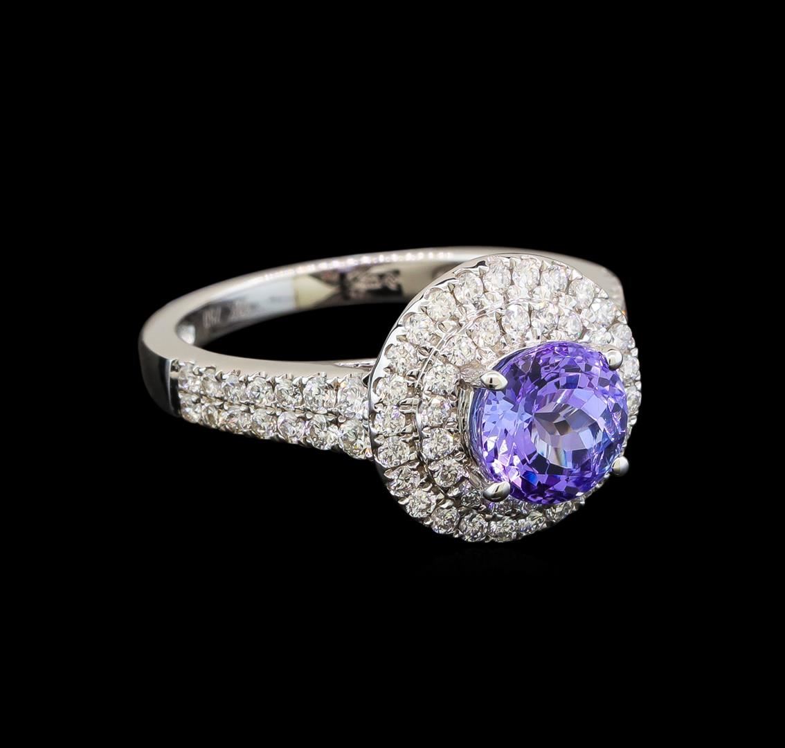 One electronically tested 18KT white gold ladies cast tanzanite and diamond ring with a bright polish finish. Identified with markings of "750". Condition is new. Containing: One prong set round modified brilliant cut natural tanzanite, measuring 6.80 - 6.80 x 4.42 mm, approximate weight of 1.37ct., clarity is eye clean, type I, light, very slightly grayish, violet color, (GIA V 3/3), cut is good. Seventy prong set round brilliant cut diamonds, measuring 1.50 - 1.20 x 0.81mm (depth est.) approximate total weight of 70 Stones = 0.50 ct. Clarity: SI-1 to I-1. Color: H - I, Cut is Good. Colored gemstones are presumed to have been subjected to commonly used enhancement processes. All diamonds and colored gemstones are graded in the mounting, unless otherwise stated. Total Weight of Colored Stones 1.37ct. Total Weight of Diamonds 0.50 ct. Total Weight of Ring 4.80 grams. GGL Appraised.
