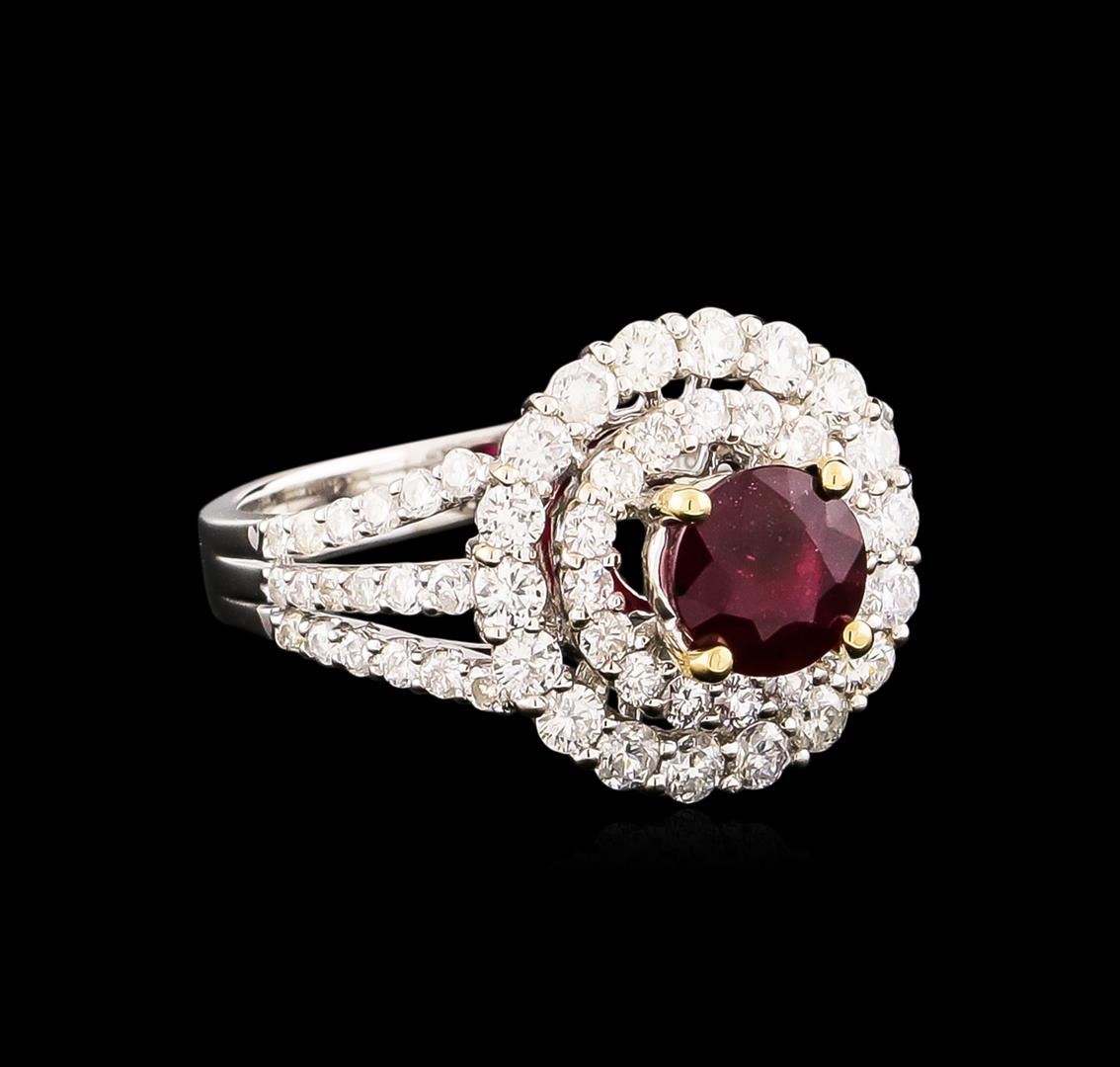 One electronically tested 18KT white gold Ladies combination cast & assembled fashion ring with a bright polish finish. Condition is new. Identified with markings of "750". Containing: Thirty-Six prong set round brilliant cut diamonds, measuring 1.30 - 1.30 x 0.78mm (depth est.) approximate. Total Weight of 36 Stones = 0.36ct. Clarity: I-1. Color: G, Cut is Good. Sixteen prong set round brilliant cut diamonds, measuring 1.50 - 1.50 x 0.90mm (depth est.) approximate. Total Weight of 16 Stones = 0.20ct. Clarity: I-1. Color: G - H, Cut is Good. Eighteen prong set round brilliant cut diamonds, measuring 2.10 - 2.10 x 1.26mm (depth est.) approximate. Total Weight of 18 Stones = 0.91ct. Clarity: SI-2 to I-1. Color: G, Cut is Good. One prong set round modified brilliant cut natural ruby, measuring 6.20 - 6.20 x 4.14 mm, approximate weight of 1.43ct., clarity is heavily included, medium dark, moderately strong, strongly purplish red color, (GIA stpR 6/4), cut is good. Colored gemstones are presumed to have been subjected to commonly used color/clarity enhancement processes. Total Weight of Colored Stones 1.43ct. Total Weight of Diamonds 1.47ct. Total Weight of Ring 5.50 grams. GGL Appraised at $4,470.00.